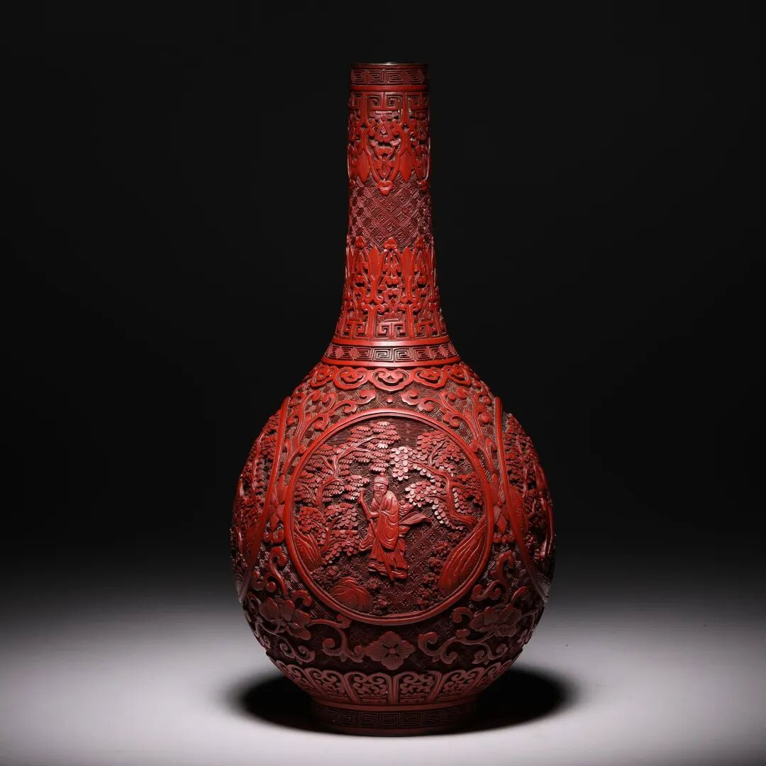 百里千刀一两漆,漆器由于资源难得,器皿制作不易,自宋元明时期就得以珍重,皇室及贵族们为制作称心的器物往往聘请巧匠,化费重金。漆器的工艺大多用于食器造型之上,例如盘,碗,盒,瓶居多。亦有不些用于生活装饰以及家具之上。这件香几内为木胎,外部由朱漆反复迭髹形成厚层,从而经雕琢打磨而成。香几的面板呈菱花形,中间开窗雕刻桃花树下鸳鸯戏水的图案,技艺精湛,灵动如生。环边和肩部也各雕有四季花鸟。五条腿各呈三弯形,修长秀美,足下有圈形托泥。本器应为茶室香道所用,可承托香炉亦可展示花生或者香瓶,形态秀美,工艺精湛,可为书房香亭增添非凡典雅之气息。
