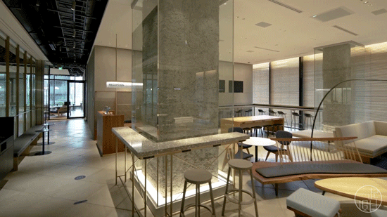 商务大楼室内外设计均舍弃了繁复的装饰元素,展示自然朴素的日式风格,立面茂盛的绿植活力满满。