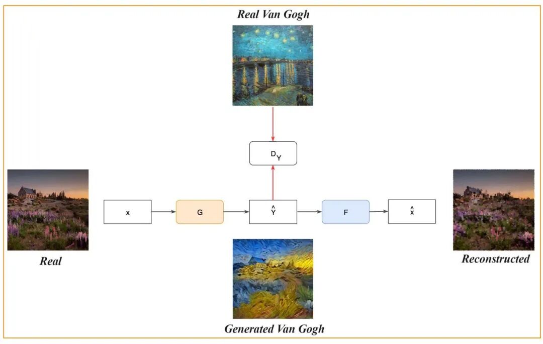 CycleGAN构建了两个网络G和F来构建从一个域到另一个域以及反向的图像。它使用鉴别器D来批评生成的图像有多好。例如,G将真实图像转换为梵高风格的绘画,并且DY用于区分图像是真实的还是生成的。