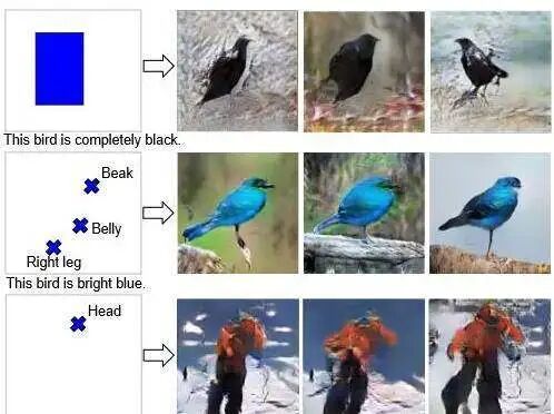 通过文本描述告诉GAN,(a)你想要得到的图像内容是什么样,(b)通过边界框/地标来告知元素的位置。看看它的生成结果: