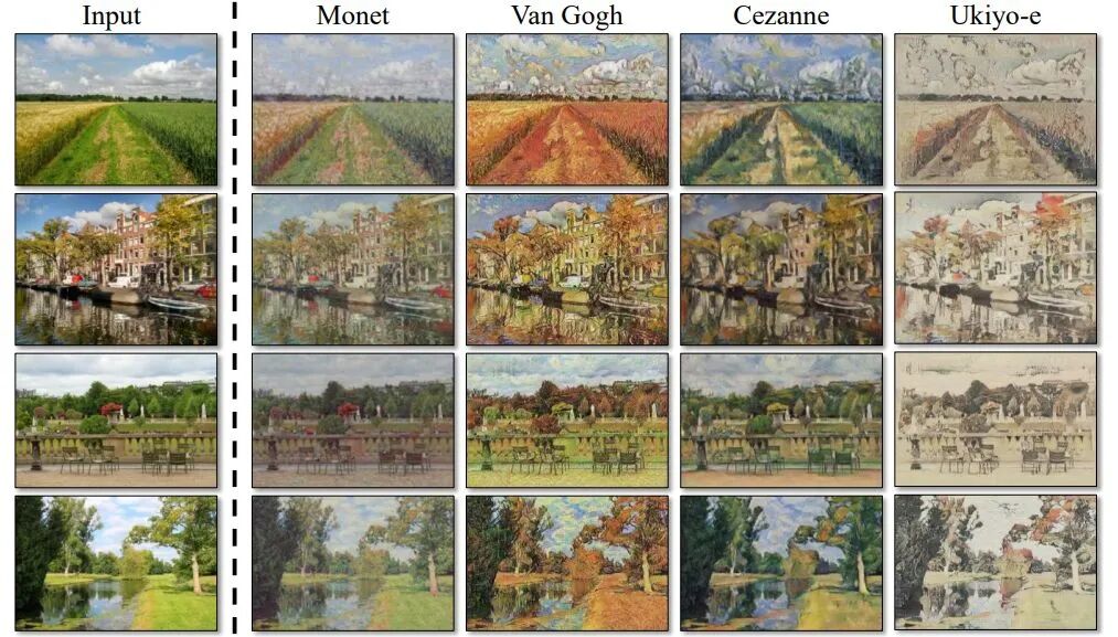 许多名画造假者费尽毕生的心血,试图模仿出艺术名家的风格。如今,CycleGAN就可以初步实现这个神奇的功能。这个功能就是风格迁移,非常适合艺术创作。比如下图,照片可以被赋予莫奈,梵高等人的绘画风格。