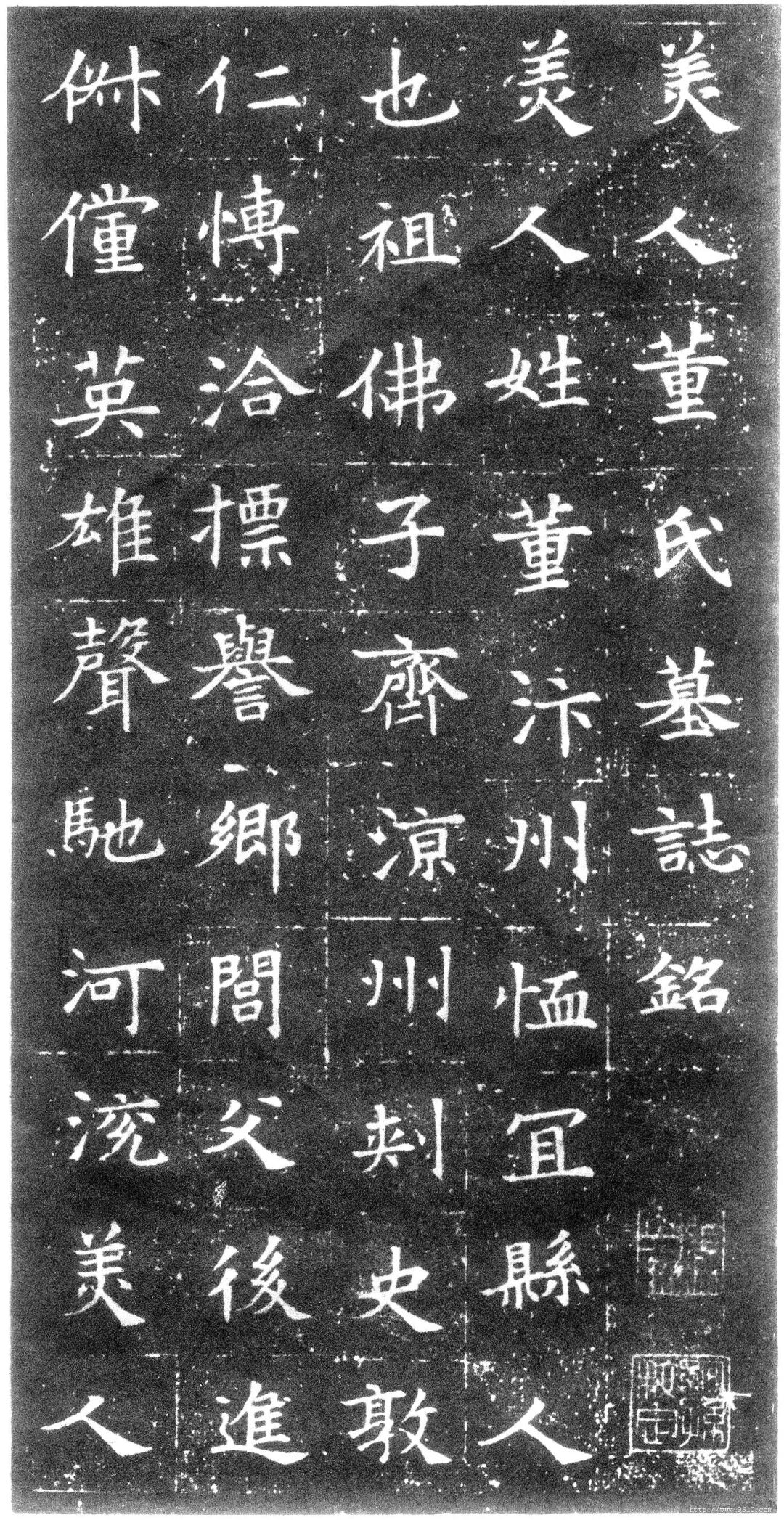 为思故人,杨秀作《董美人墓志》,全称《美人董氏墓志铭》。全文哀恸悲切,感人至深,寄托了对董美人无限哀思与怀念。楷书,二十一行,行二十三字。结体端庄秀丽,严谨遒劲,为隋志小楷第一,备受书家推崇。