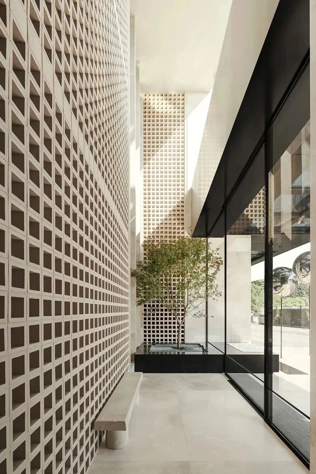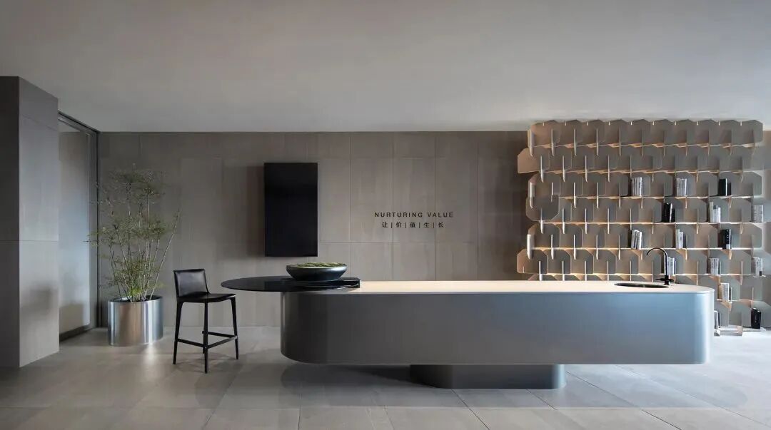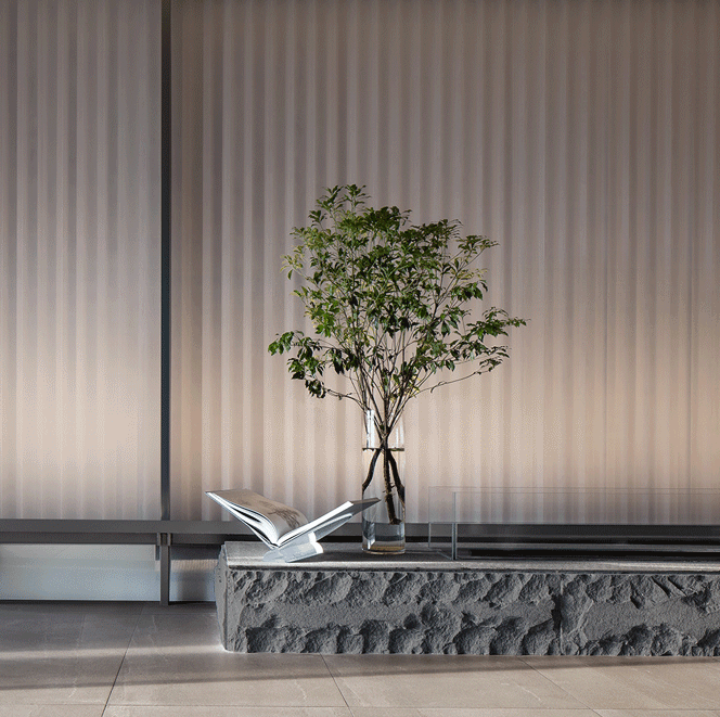 前台设置造型简雅,融入园林手法营造空间,水纹玻璃、大理石体块、木纹墙面将视觉隔断,引导体验的布局与流线。