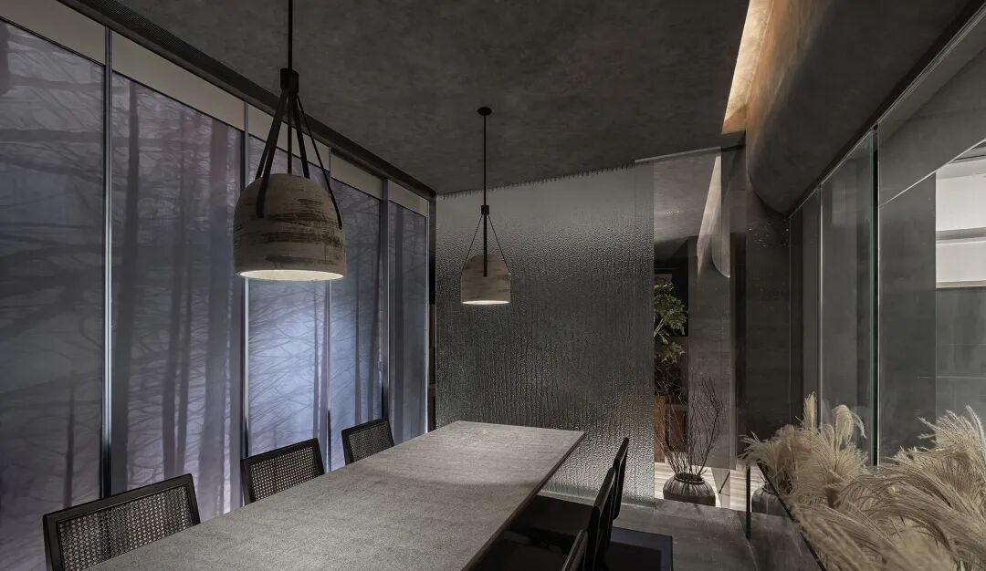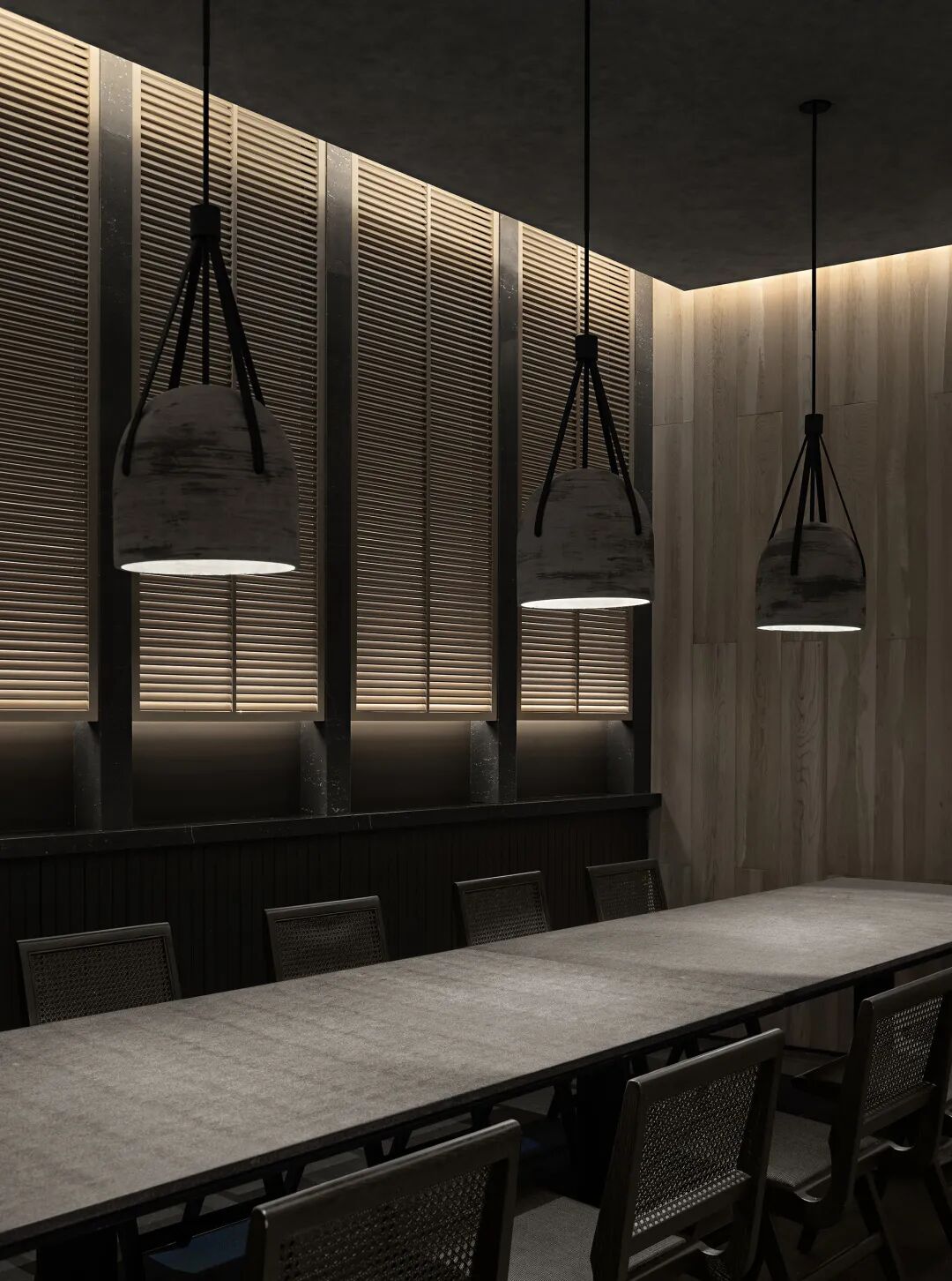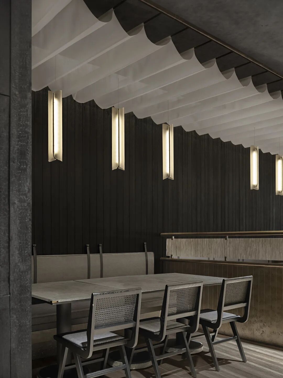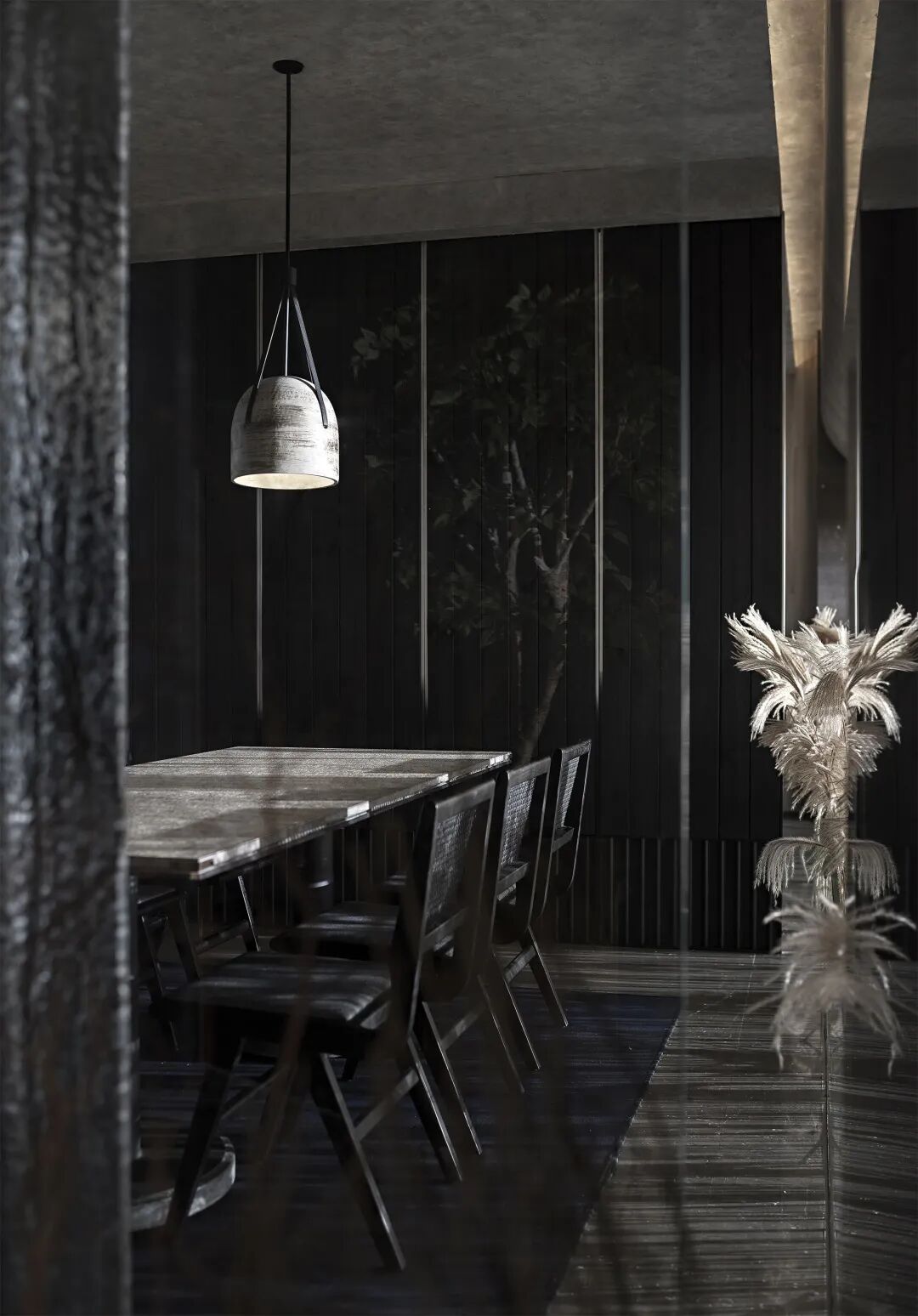 不同高度、形状各异的“渔船灯”,聚焦在满桌佳肴上,打造幽暗静谧的沉浸式就餐体验。深灰色木质和铁制桌椅,充满时间的沧桑感。
