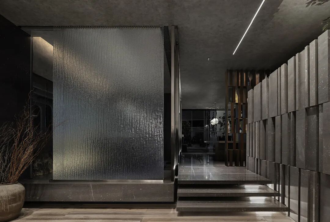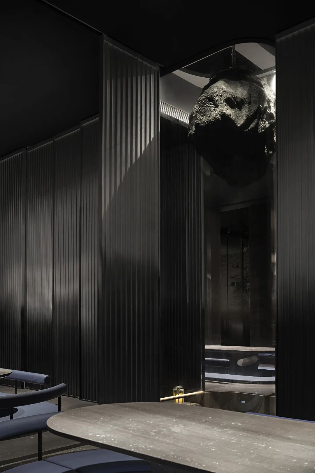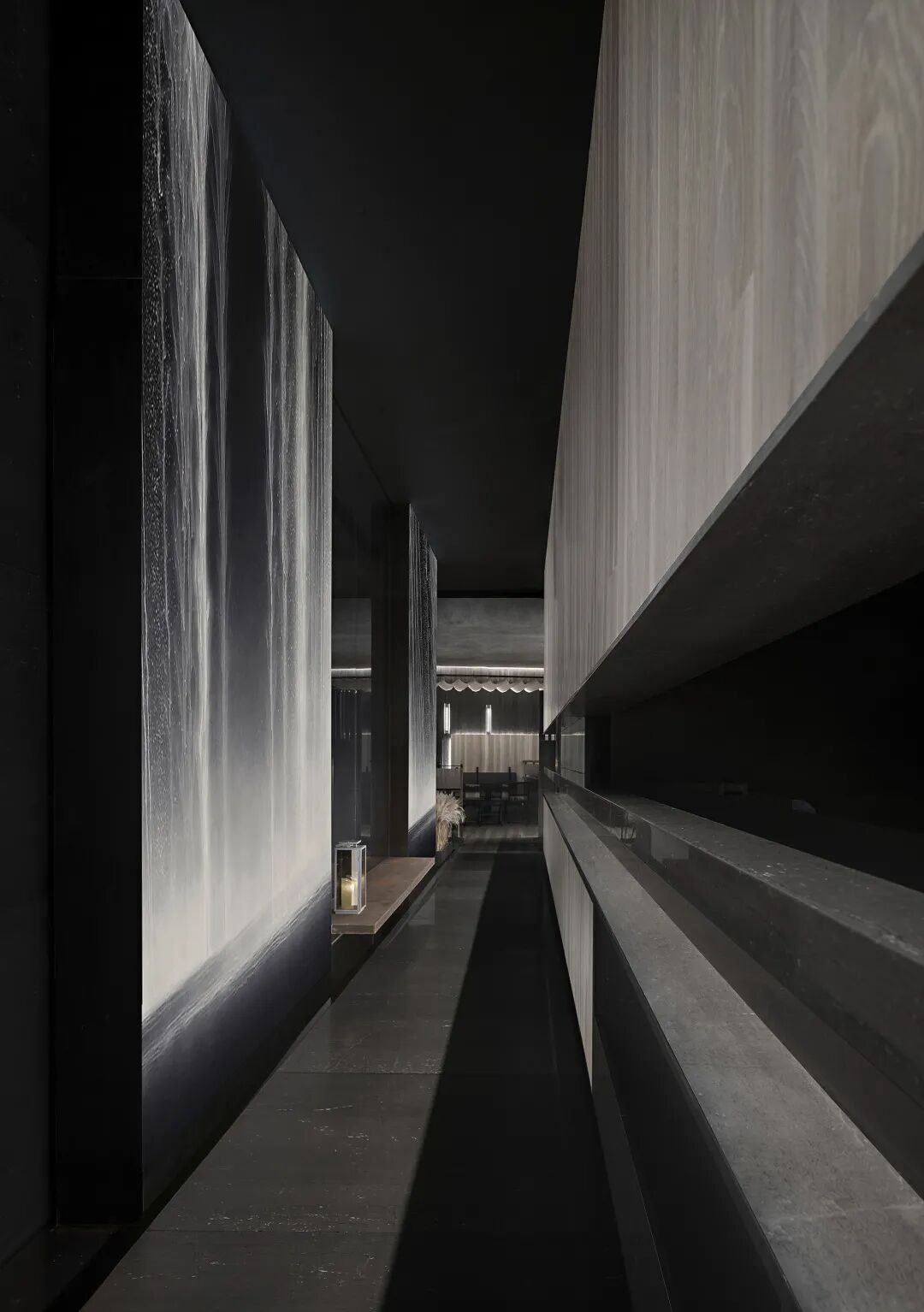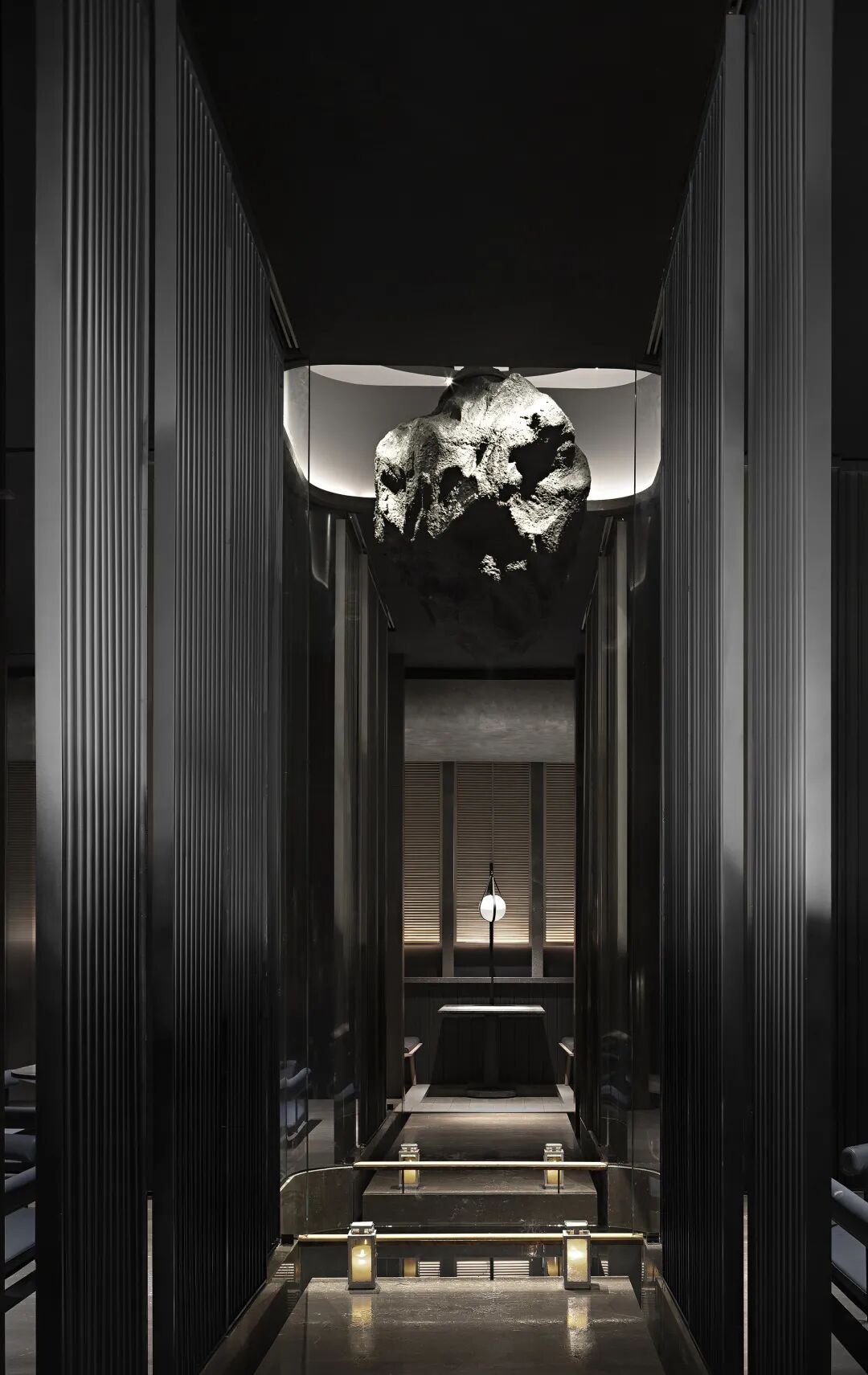 中心包间“水聚天心,四水归堂”为构思,“堂”外LED投影幕墙仿若高墙重门,穿过“过厢堂道”,走进静谧的“堂”中。