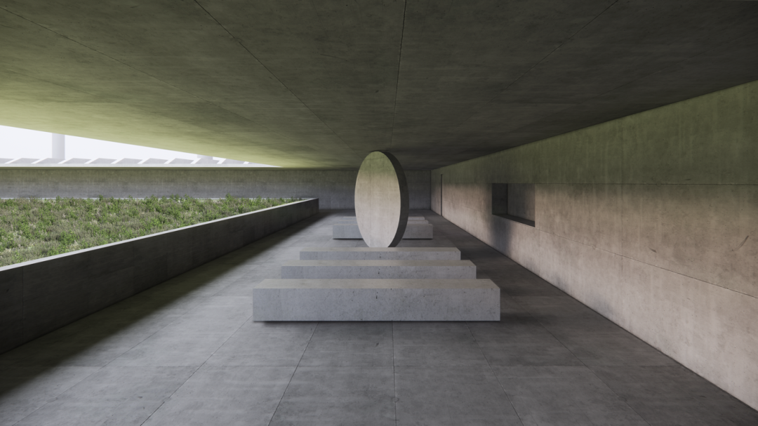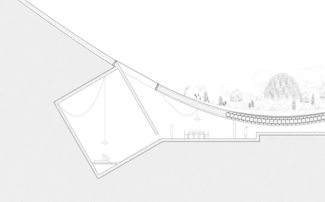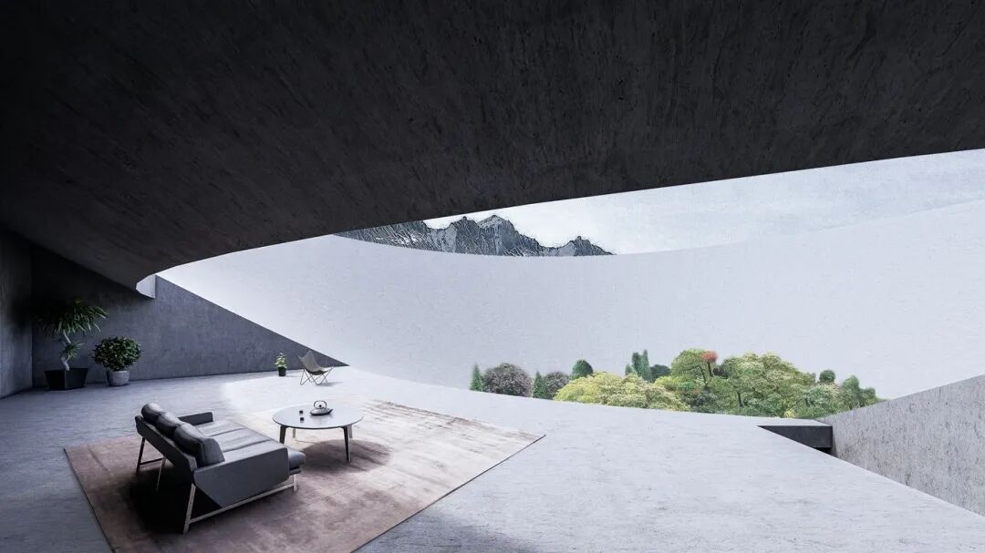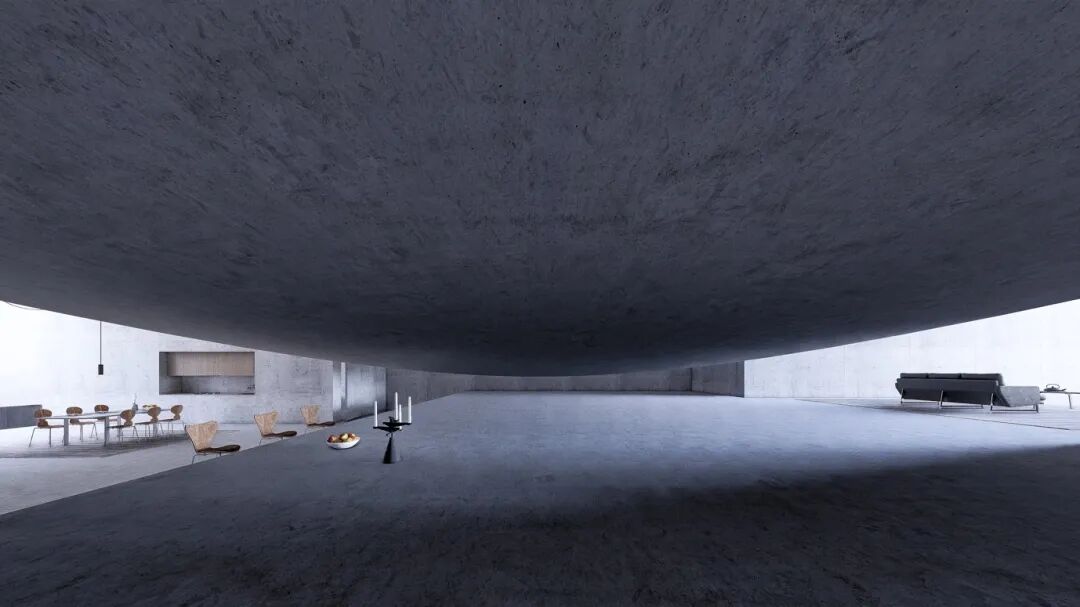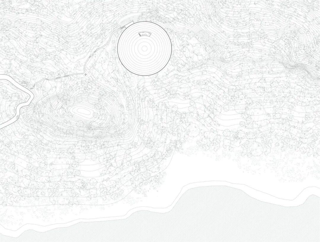 设计由地上与地下两部分组成,地下部分为住宅主体生活部份,包括客厅、餐厅等生活空间;地上部分为住宅外部辅助空间,包括外院、露台与花园。住宅场地位于三面环山、一面朝海的山洼之中,住宅主体屋顶由一个直径为 67 米的倒置的穹顶构成,穹顶本身融入周围等高线向中心凹陷,于最低洼处形成屋顶花园。当人身处外部时,穹顶是地面,建筑与周围自然环境浑然一体;当人走进建筑时,穹顶变成了屋顶,变化的弧形屋面会于建筑内部不同空间给人带来截然不同且丰富的空间体验——当人走入门厅,穹顶最低点会给人带来强烈的向两边“推”的空间挤压感;当人走向客厅等公共空间,屋面高度不断放大,将人“推”向外部自然风景;当人走向卧室的私密空间,向两边降低的屋顶有会给人十足的安全感与舒适感。