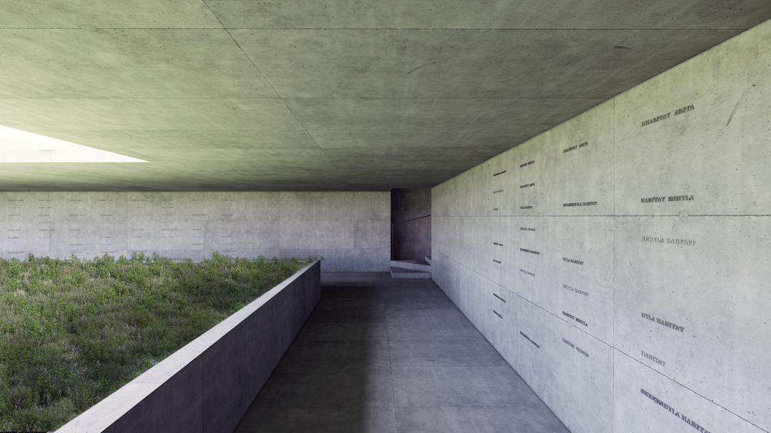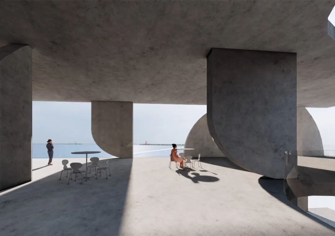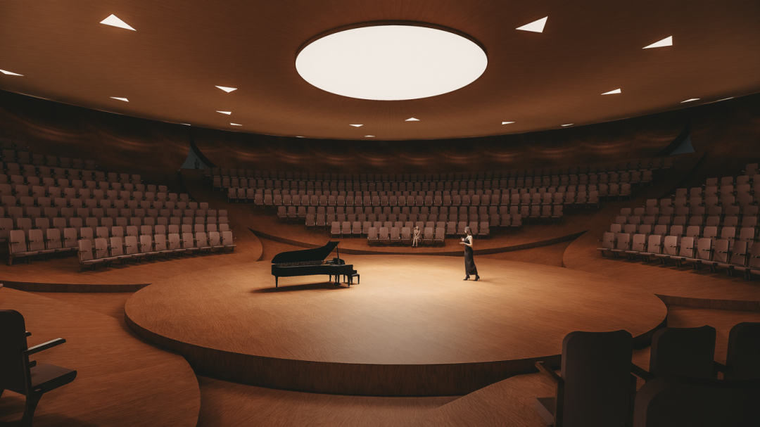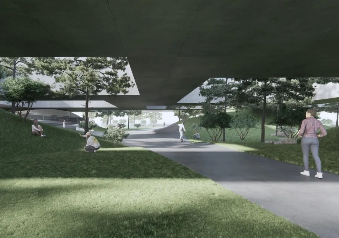 设计由地上与地下两部分组成,地下部分为住宅主体生活部份,包括客厅、餐厅等生活空间;地上部分为住宅外部辅助空间,包括外院、露台与花园。住宅场地位于三面环山、一面朝海的山洼之中,住宅主体屋顶由一个直径为 67 米的倒置的穹顶构成,穹顶本身融入周围等高线向中心凹陷,于最低洼处形成屋顶花园。当人身处外部时,穹顶是地面,建筑与周围自然环境浑然一体;当人走进建筑时,穹顶变成了屋顶,变化的弧形屋面会于建筑内部不同空间给人带来截然不同且丰富的空间体验——当人走入门厅,穹顶最低点会给人带来强烈的向两边“推”的空间挤压感;当人走向客厅等公共空间,屋面高度不断放大,将人“推”向外部自然风景;当人走向卧室的私密空间,向两边降低的屋顶有会给人十足的安全感与舒适感。