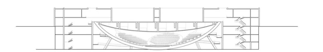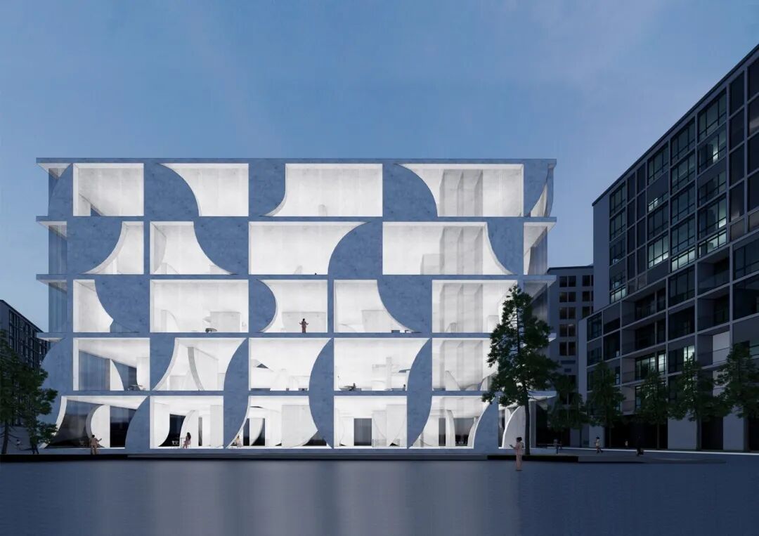 办公楼的基地位于上海西岸艺术园区内,濒临黄浦江畔。建筑结构为简单的梁柱体系,特别的是,结构柱被异化成了不同的扇形,为建筑结构赋予了一种物体感。而扇形柱收缩的纤细顶端,使楼板看起来仿佛只是轻轻地搭在柱子上方,整个建筑显得轻盈。此外,由于柱子在办公楼内部均质分布,空间的划分显得自由且流动,建筑空间的丰富性得以提高。气候边界则采用透明的玻璃围护在建筑最外层结构的内部,从远处江边看过来,建筑仿佛就是简单连贯的圆弧曲线构成,简洁而通透。