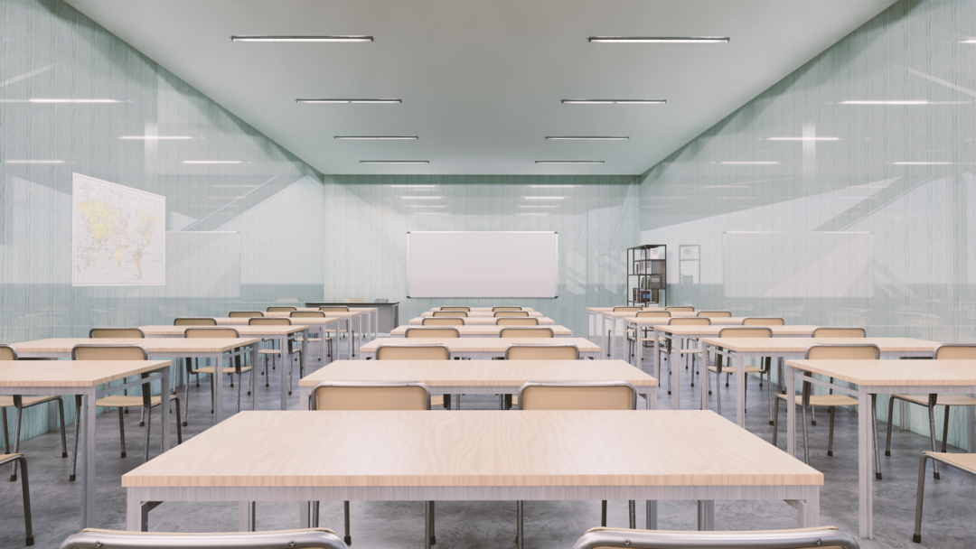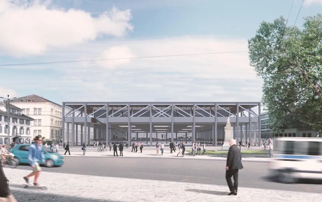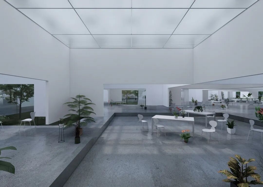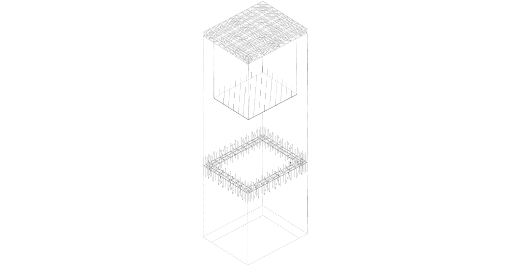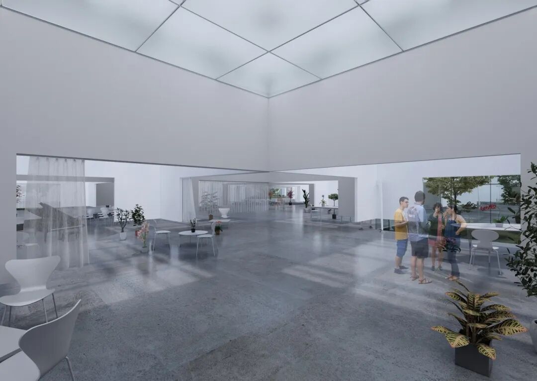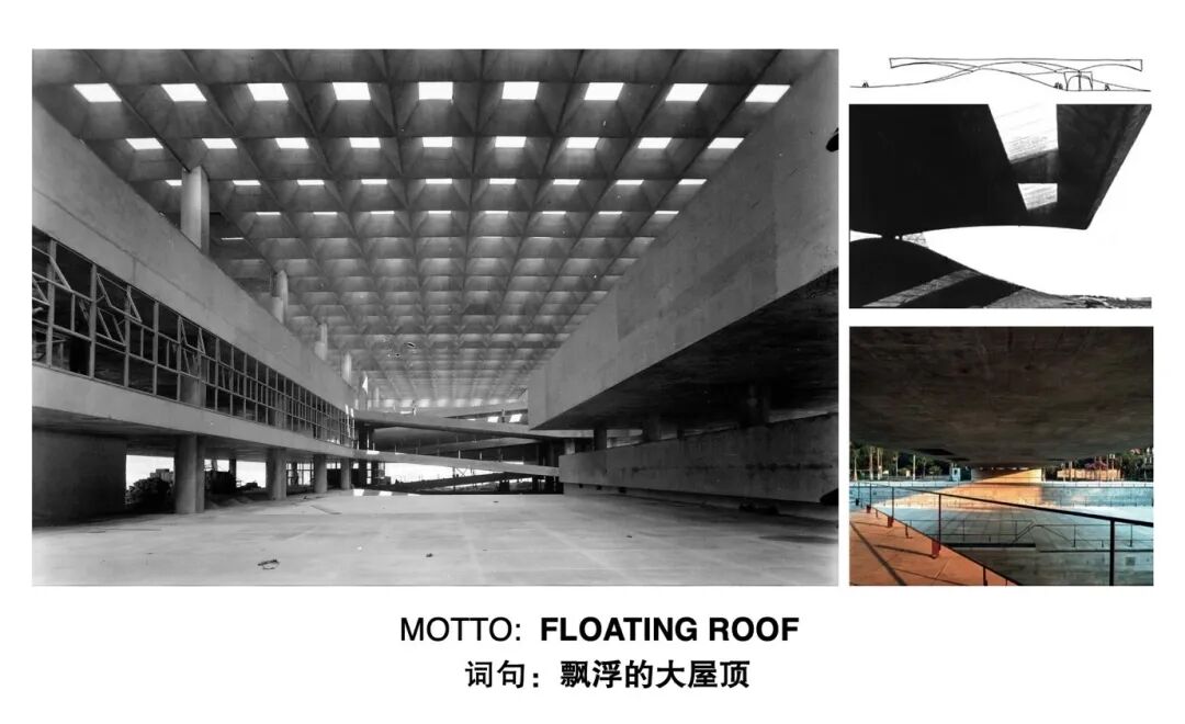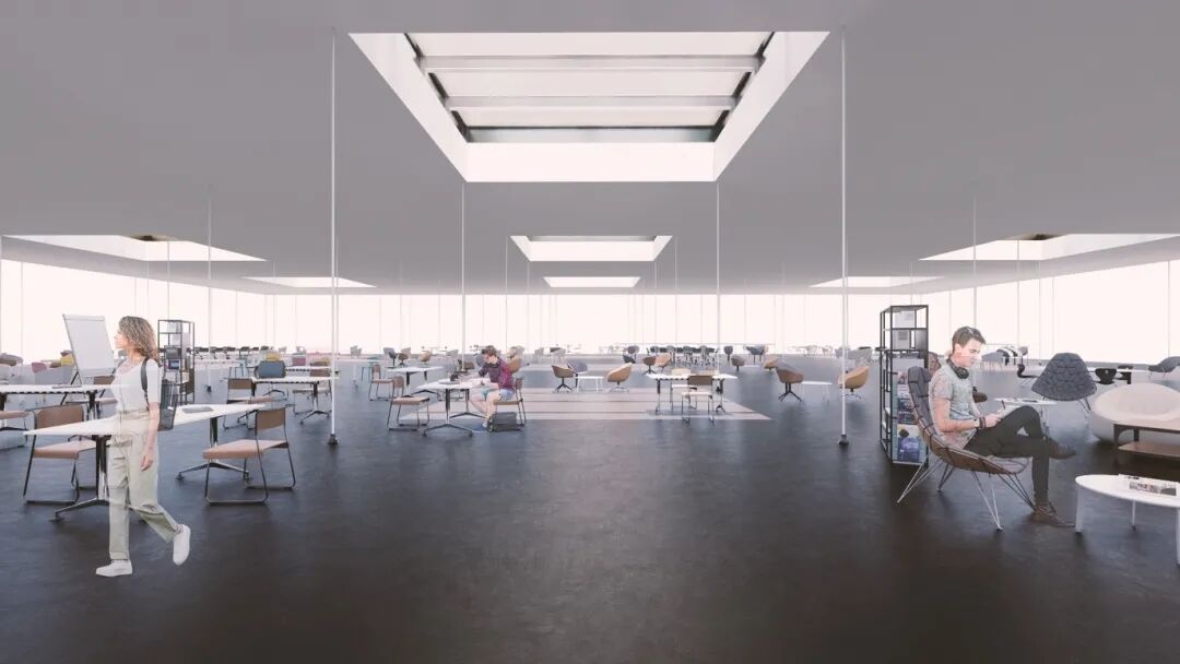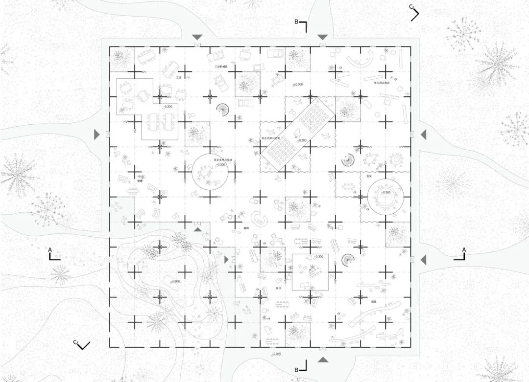设计方案是一个漂浮的学习中心——该建筑为72m×72m,采用6m的网格体系构成。其一层为活动层,并配有三个满足辅助功能的地下室。梁这一通常只被视作结构作用的构件,在这个有着巨大流动空间的毯式建筑中起到界定空间的作用。从梁上垂下的十字形短板悬浮于地面,在这个开放的建筑中提供相对私密的空间。局部不同形状的下沉地面与悬浮的短板以及窗帘等一起参与了空间的划分。为了实现概念,空间桁架被用来满足梁和挂板的高和薄,并使得在尽量少落柱子的情况下满足大跨度的需求。屋顶的照明控制是构造设计的要点,以达到通过照明调控满足不同情景使用需求的目的。墙的消失令整个建筑是四通八达的——学生们可以更自由地使用空间。家具和被随意地摆放的绿植共同营造出与空间概念相适应的、轻松愉快的学习氛围。