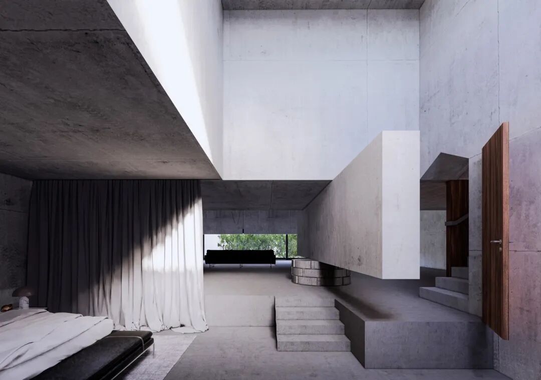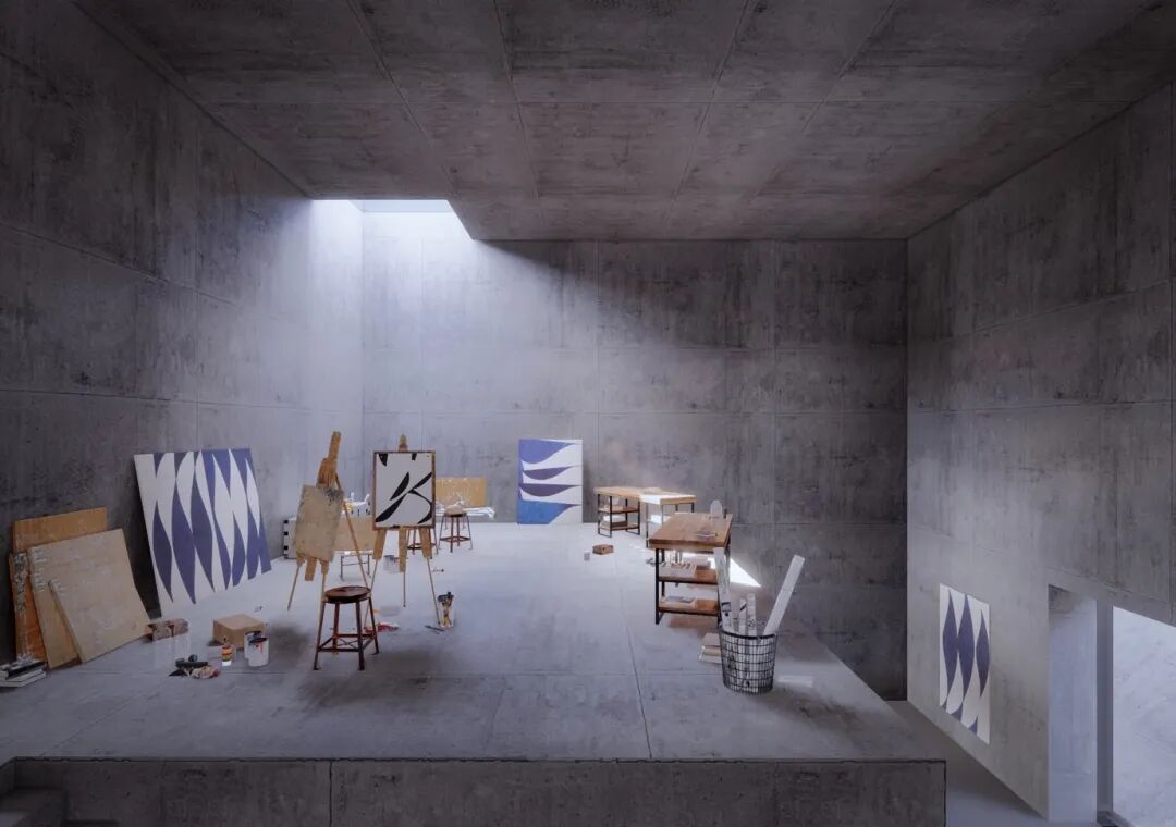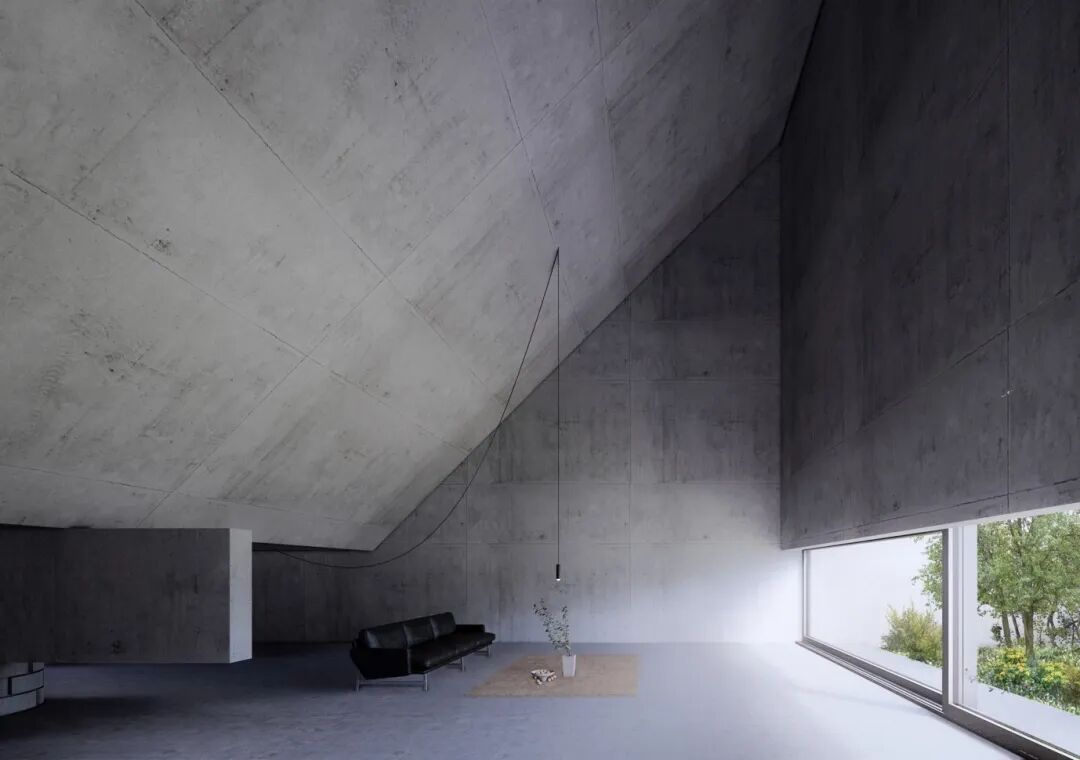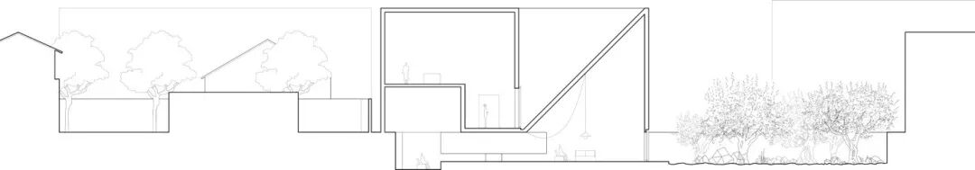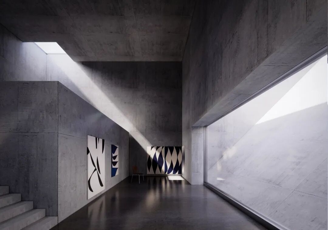 该设计由地上和地下两部分组成,地上为—个可对外开放的工作室(陈列艺术家自己的作品以及供办公使用),地下为艺术家之家。—条既是屋顶又是地面的结构线介入了该建筑,使其上下两分而产生了戏剧性的效果。在剖面上:作为住宅的屋顶,这条结构线让住宅三分,由内到外,从私密到公共;作为工作室的地面,巨大的斜坡给工作室引入了迷人的光线。在住宅的中心,粗壮的混凝土梁柱似乎支承起了整个工作室,颇具物体感的结构又将住宅两分。在这个建筑中,这条既是屋顶又是地面的结构线将对外与对内、地上和地下、艺术与生活联系起来,使之成为—个不可分割的整体。