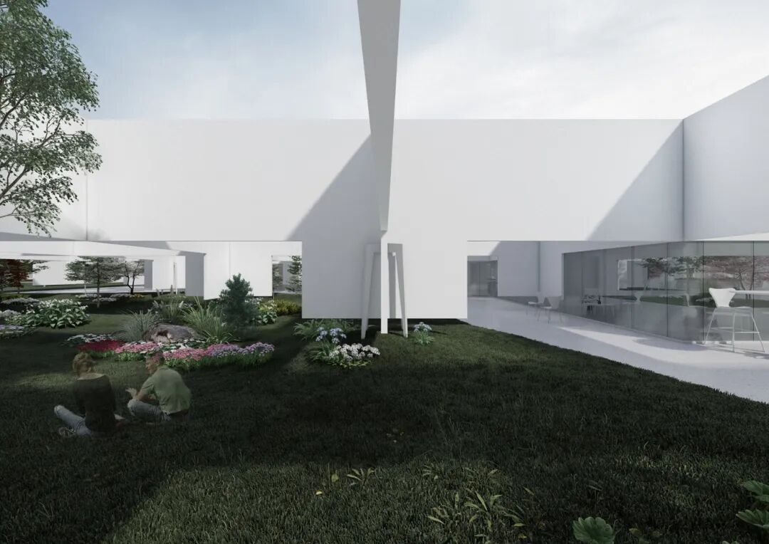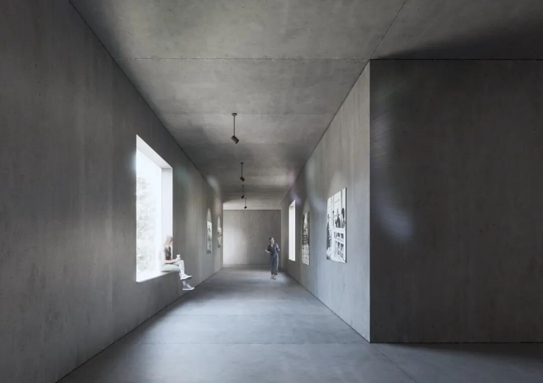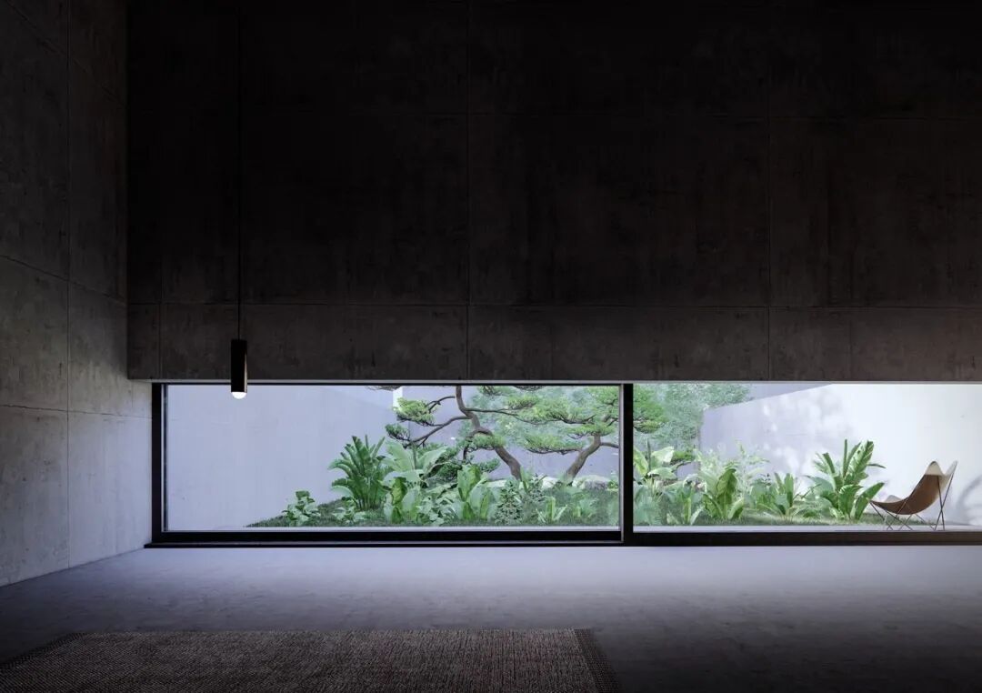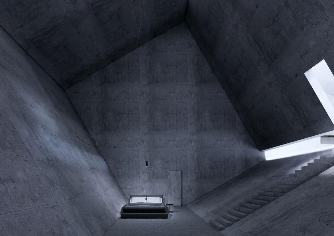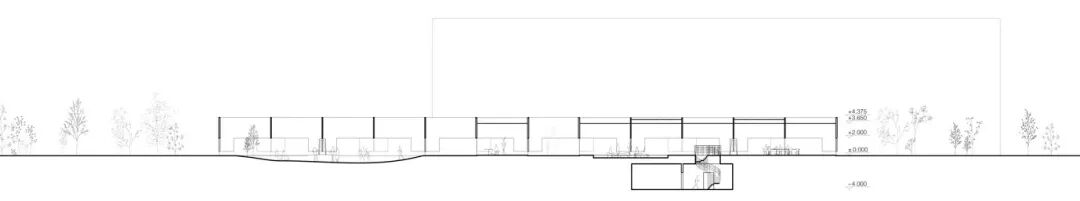 该设计由地上和地下两部分组成,地上为—个可对外开放的工作室(陈列艺术家自己的作品以及供办公使用),地下为艺术家之家。—条既是屋顶又是地面的结构线介入了该建筑,使其上下两分而产生了戏剧性的效果。在剖面上:作为住宅的屋顶,这条结构线让住宅三分,由内到外,从私密到公共;作为工作室的地面,巨大的斜坡给工作室引入了迷人的光线。在住宅的中心,粗壮的混凝土梁柱似乎支承起了整个工作室,颇具物体感的结构又将住宅两分。在这个建筑中,这条既是屋顶又是地面的结构线将对外与对内、地上和地下、艺术与生活联系起来,使之成为—个不可分割的整体。