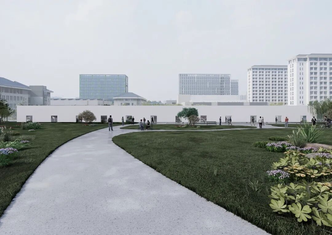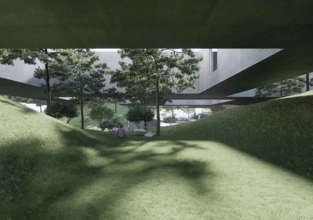 校史展览馆的基地位于东南大学九龙湖校区的西门附近,场地地势起伏不平并有大量植被覆盖。考虑到对地形和植物景观优势的利用,一个巨大的屋顶落在了起伏的山包上,屋顶中开有洞口采光。整片屋顶由洞口墙体拉结上下楼板形成了一个统一整体,并由四个隐藏在山包中的交通核心筒作为支撑,其余地方不设置落地柱,让整个屋顶更加具有漂浮在山包上的感觉。同时,学生们也可以经由交通核心筒或山包上的步行坡道进入校史展览馆内,4m*4m 的部分用于流动参观,8m*4m 的部分用于节点处集中布展,学生们既可以在洞口处观赏外部情景,也可以在宁静的展廊中感受历史的变迁。