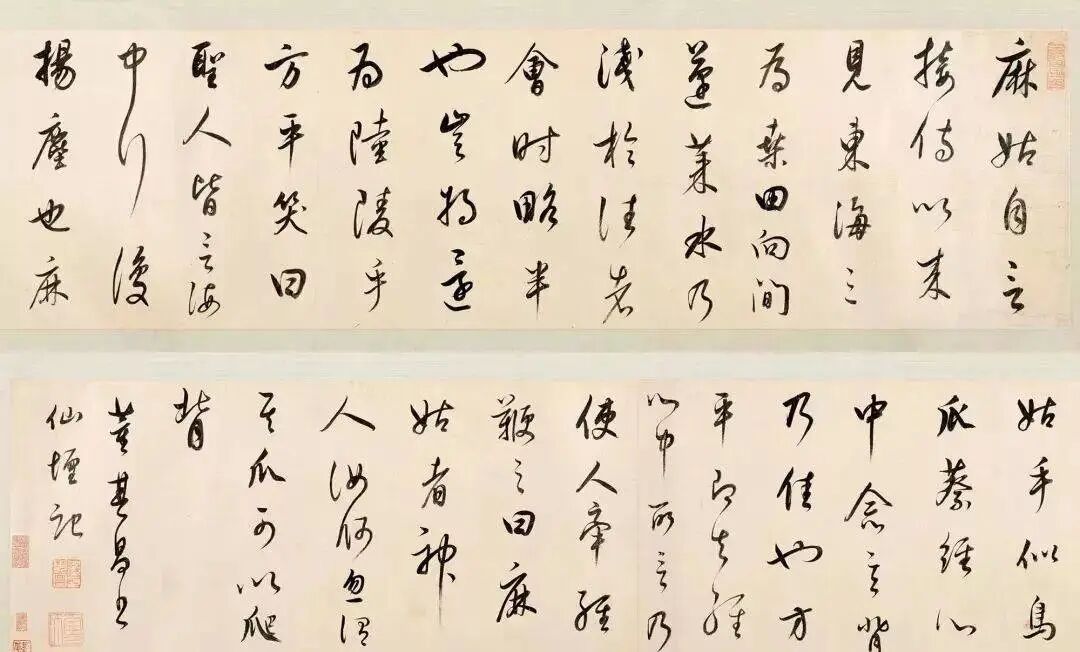 到了明代, 学识渊博,精通禅理的书画大家董其昌以略带米芾意趣的大字行草节录颜真卿《麻姑仙坛记》,形成了我们今天所见的《董其昌节录〈仙坛记〉》 竟写出了清雅秀逸之风。