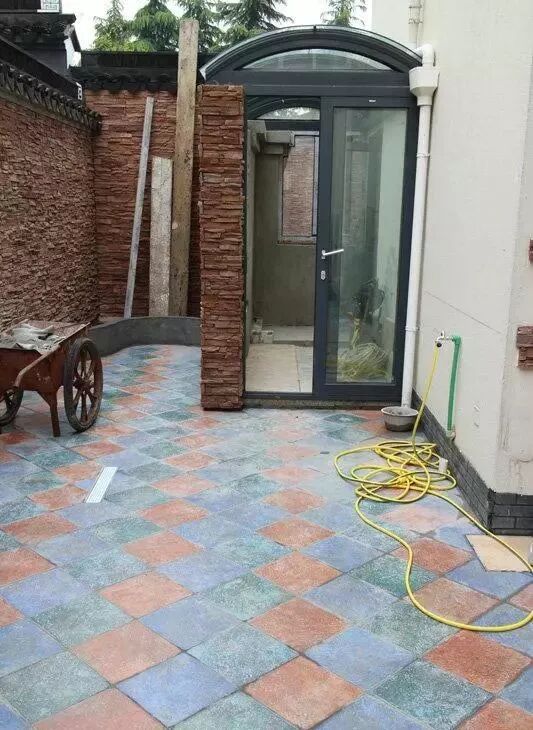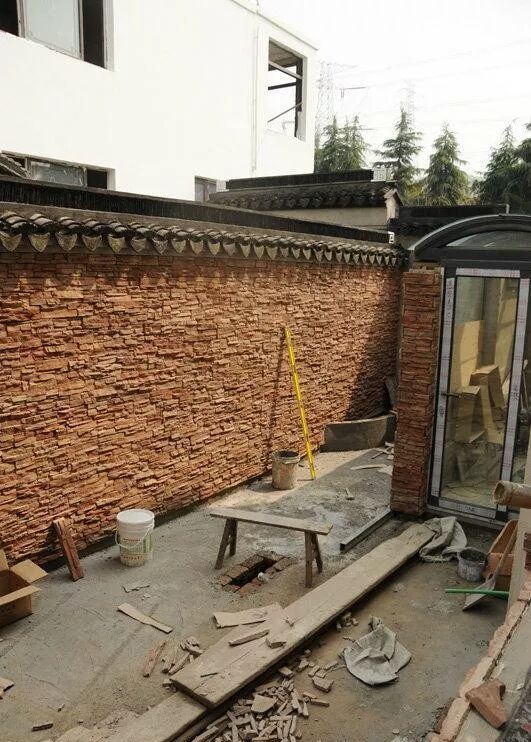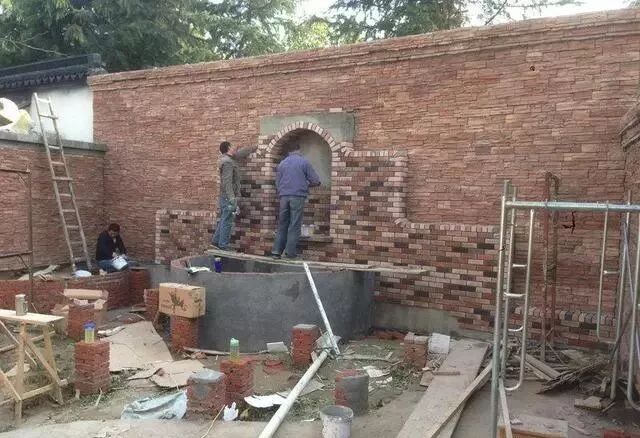 开始贴水池上方的墙面。这款外墙砖很美貌的说