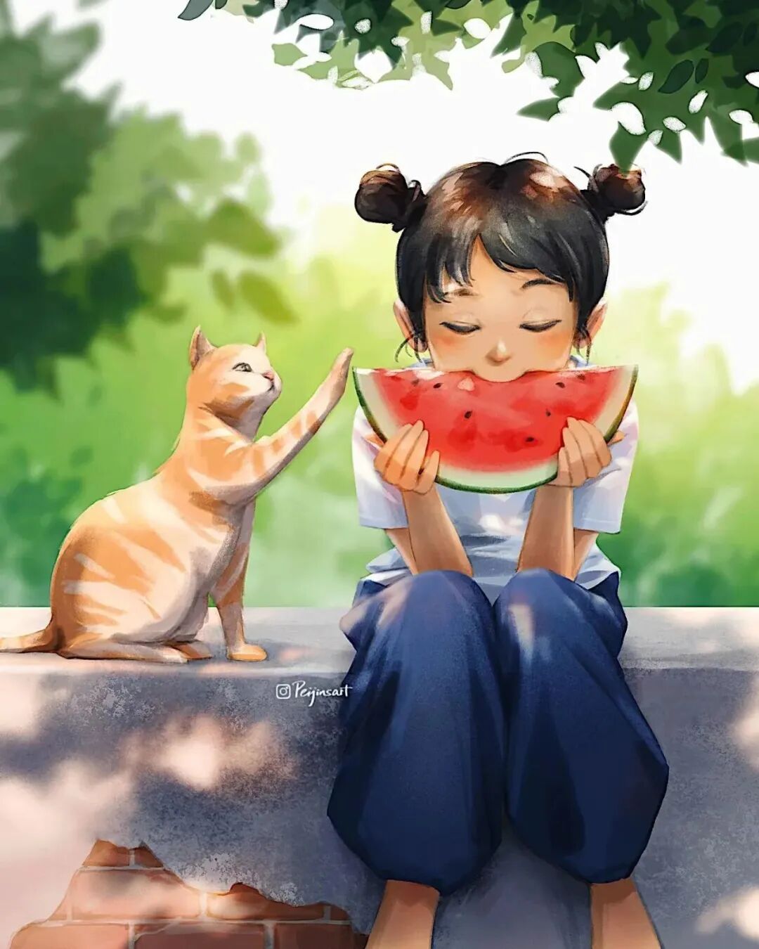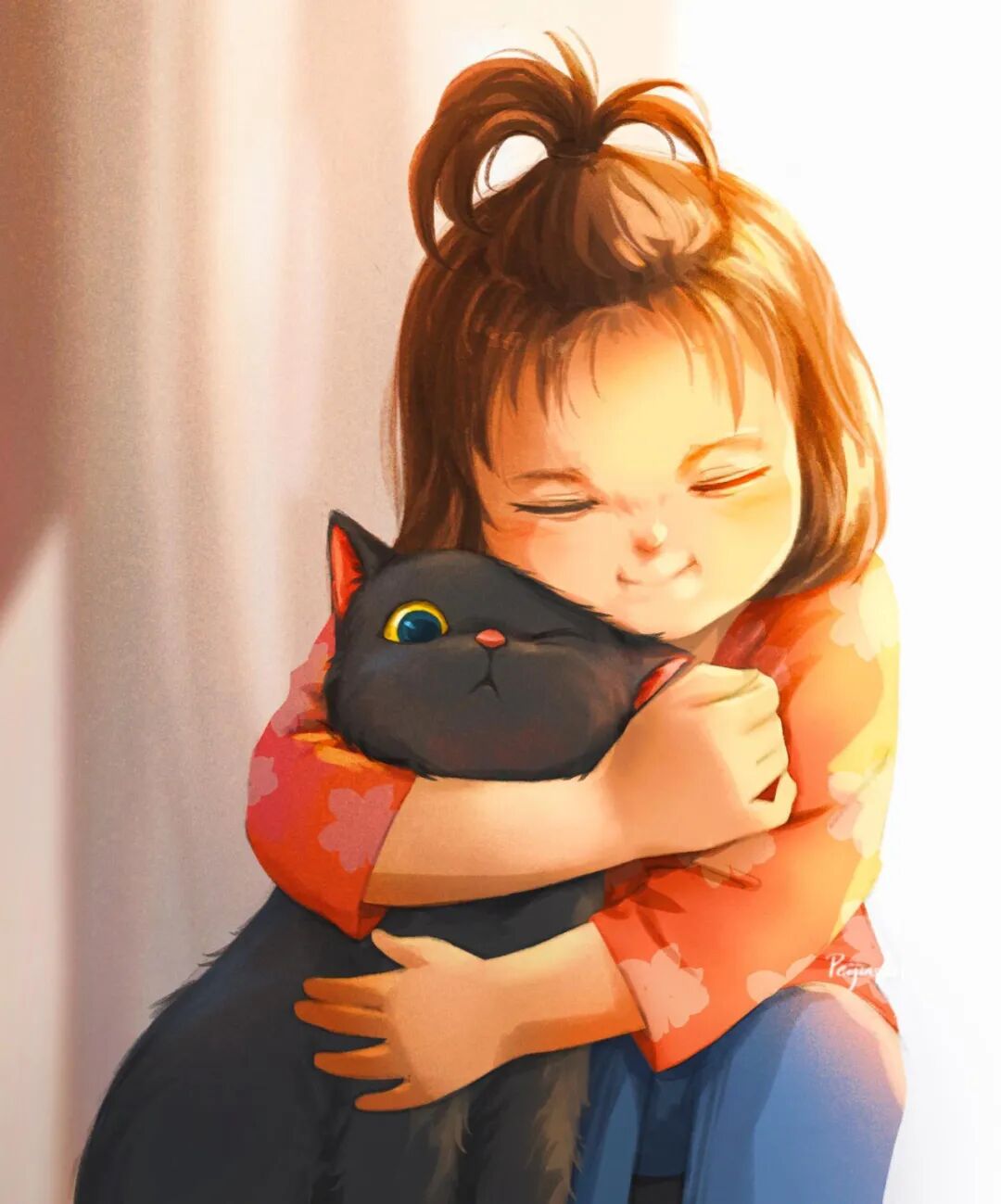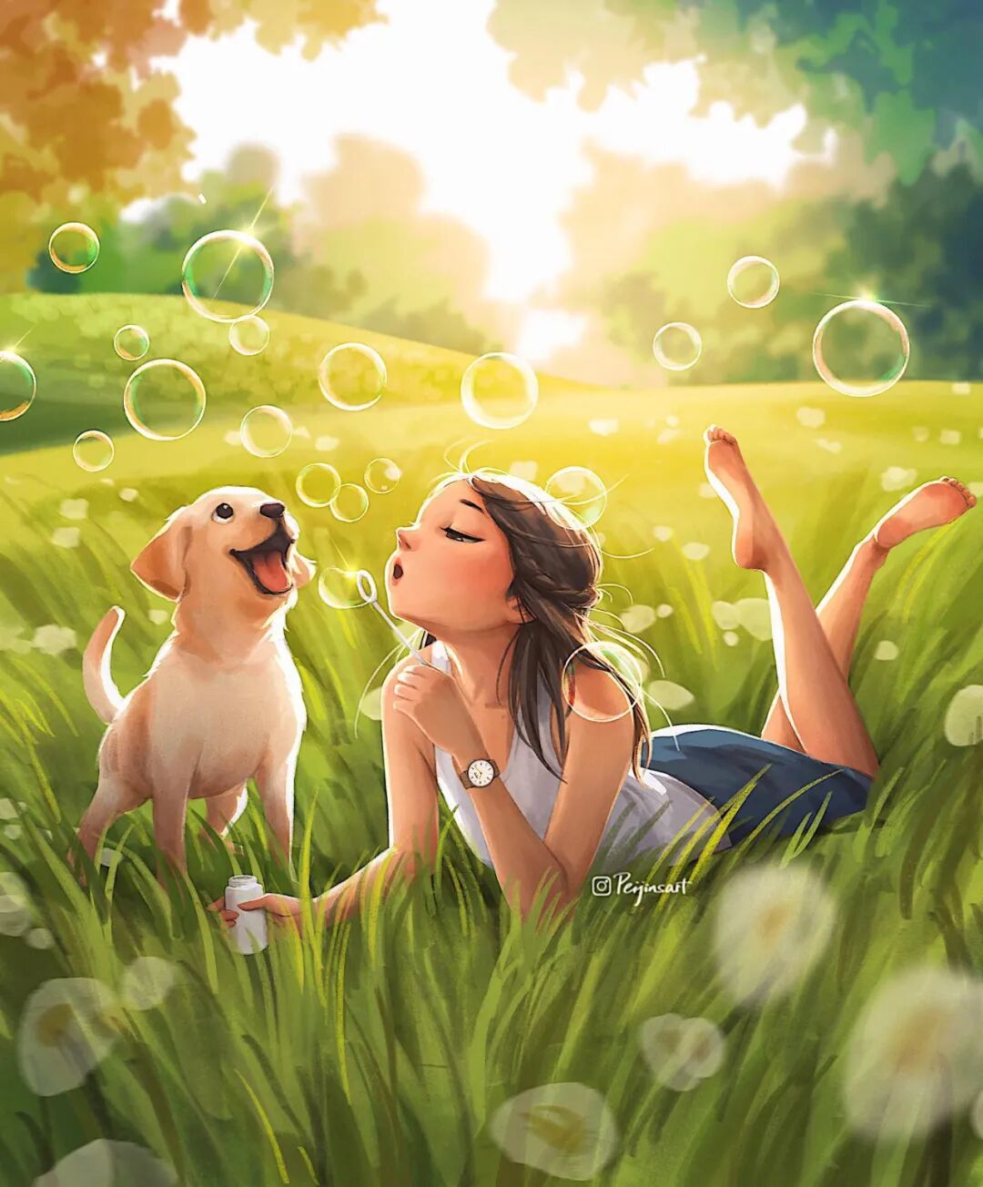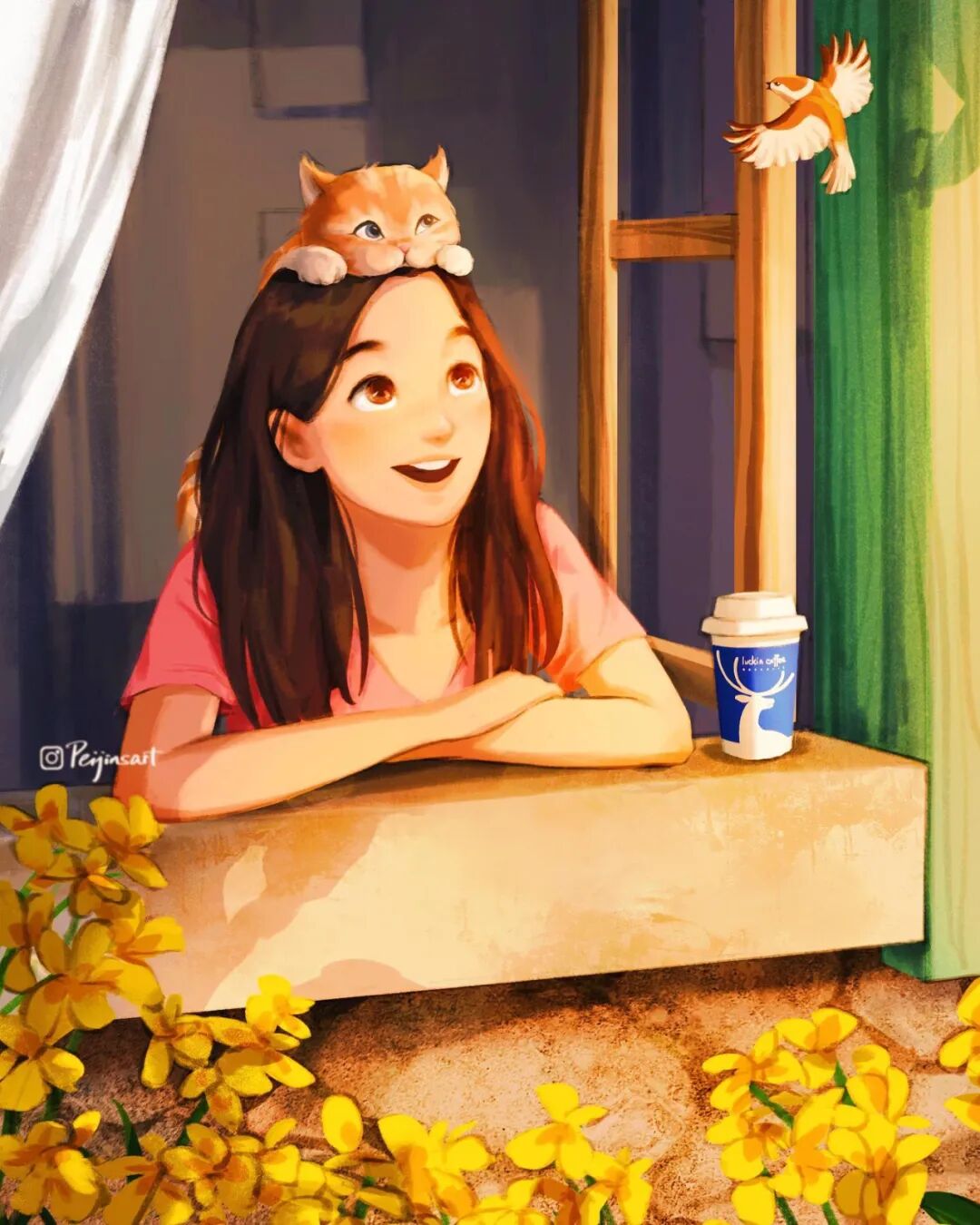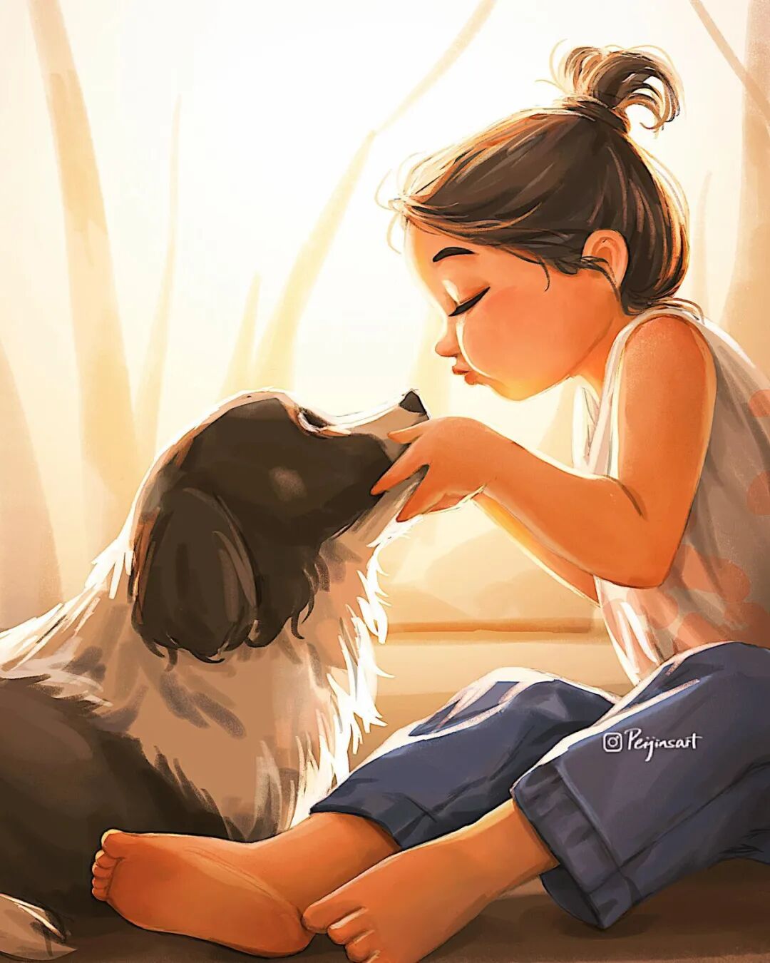 从这些插画作品中,我们就能感受到这位艺术家对动物的喜爱,裴锦·杨非常擅长捕捉生活中的细节,对光影的渲染能力也极强,她的作品总能带给人感染力,温暖的光影洒在女孩与动物的身上,让人感觉岁月静好,柔和的氛围让整个世界都似乎柔软起来。