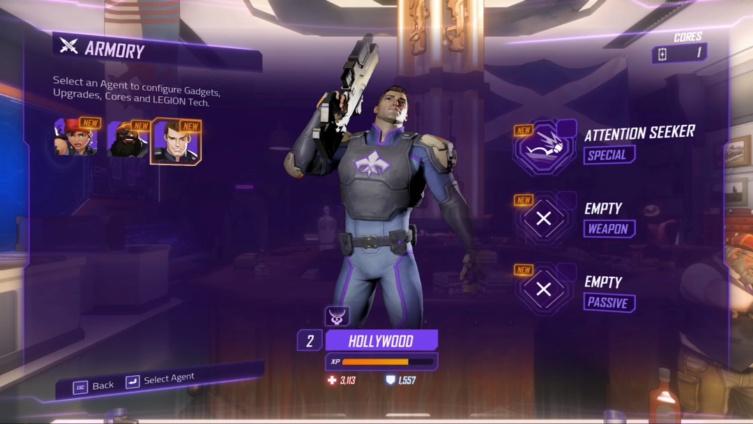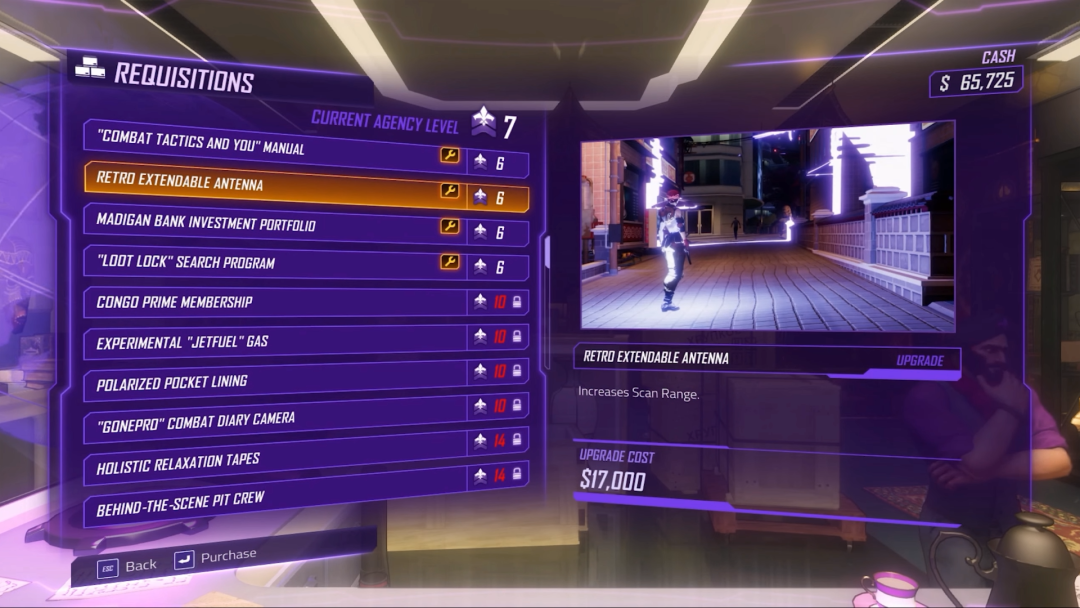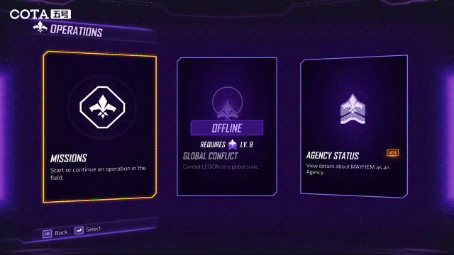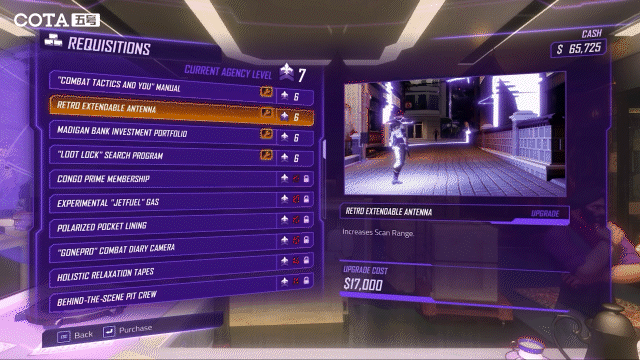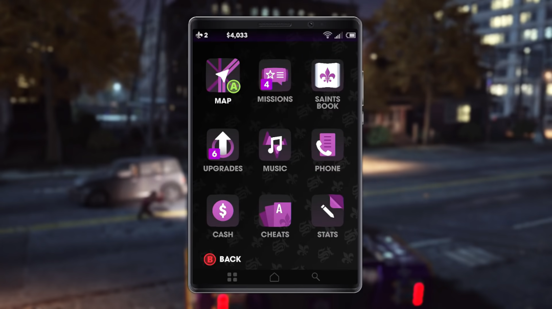 这是一款混合了科技感和美式卡通风格的游戏,与此前我们在卡通类风格动效设计的文章里讨论过的《瑞奇与叮当》(点此回顾)有很多相似之处。但相比而言,《混乱特工》的画风要相对严肃一些。因此该游戏界面中混合有大量科技类元素设计,美卡画风是其独有性所在,以及延续了“黑道圣徒”系列的紫色主题配色这一特点,如下两图为《黑道圣徒3》的截图: