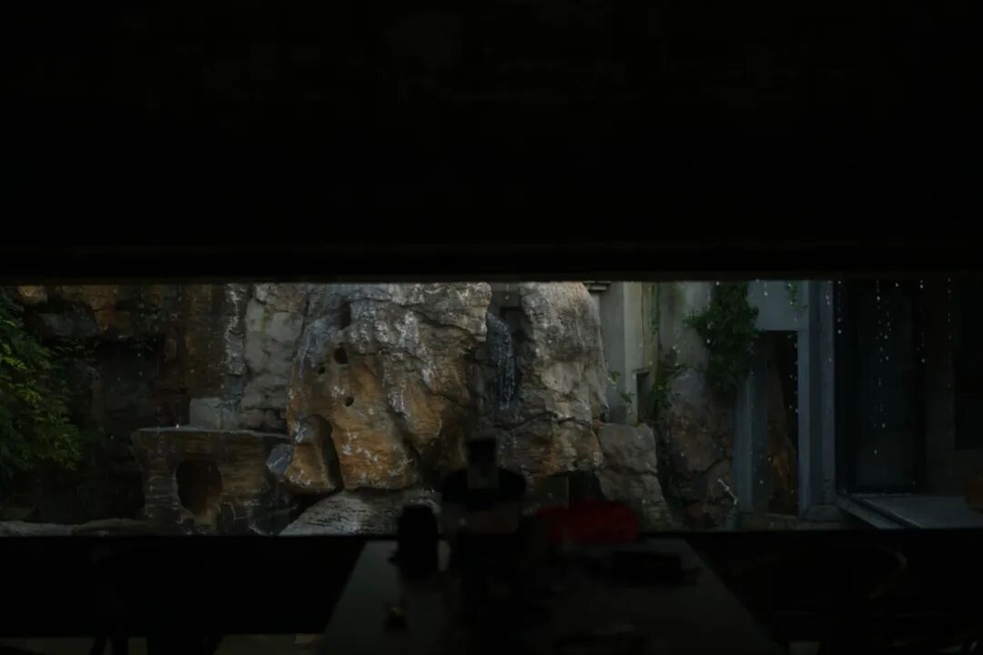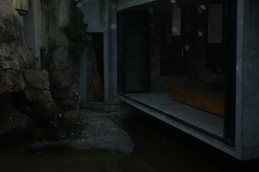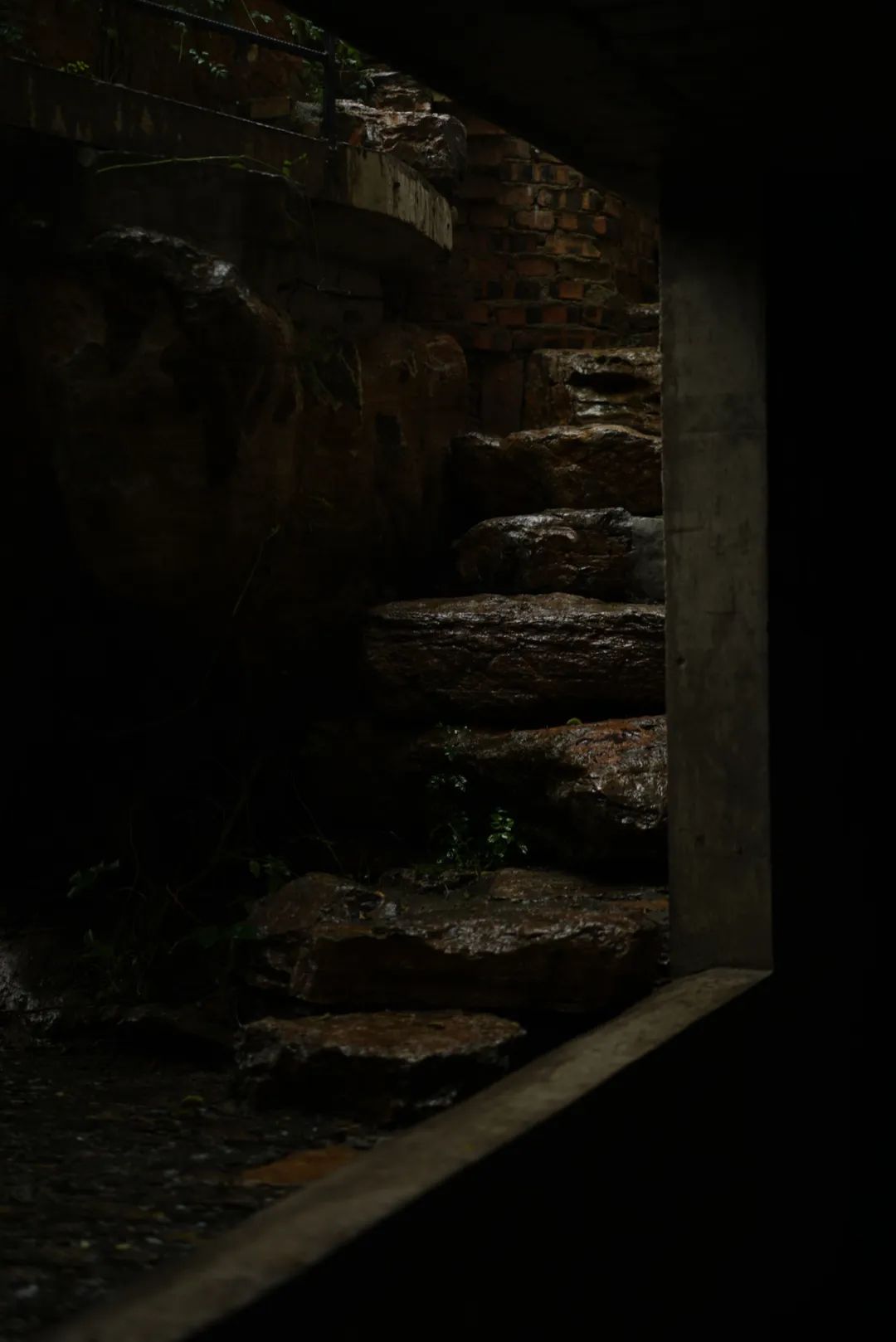 入口处,水从天花板往下滴,在地下室汇聚,滴滴答答的水声,强化了地下室山洞的意向
