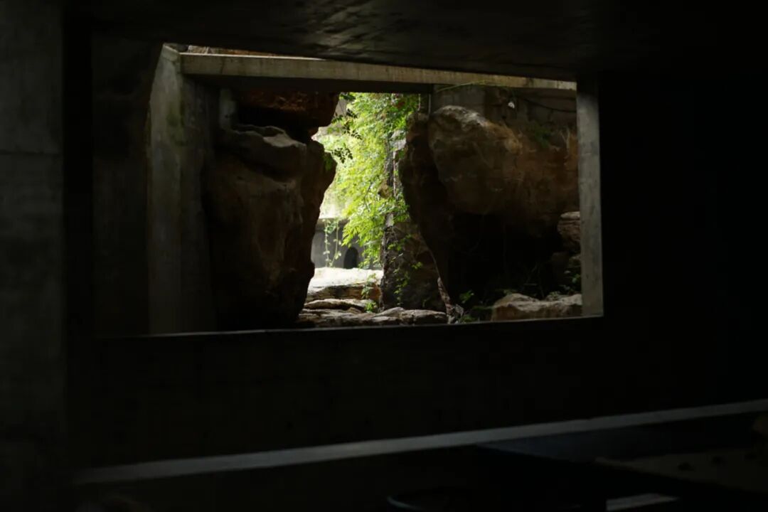 地下室的南侧,有一扇通风的高窗,窗外堆了一座小小的石壁,形成穿过这个房子,还是山的意向,摄/曾仁臻