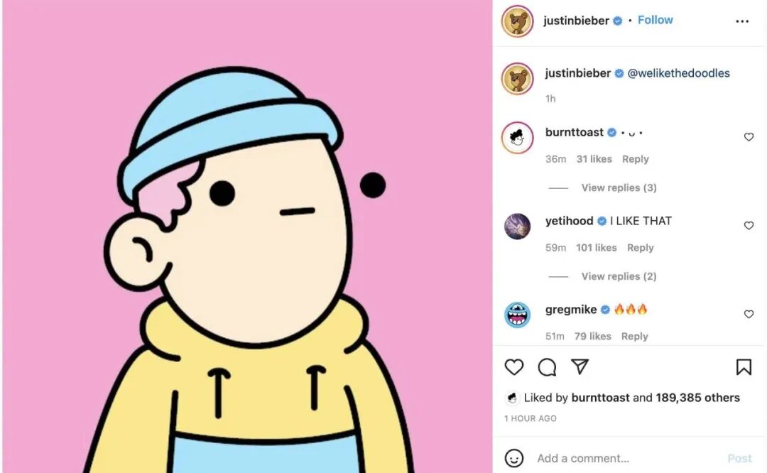 Justin Bieber也一直是Doodles的坚定支持者。他收集了大量Doodle NFT,并定期在社交网络上分享。最近,Justin Bieber在Ins上发布了他的Doodles NFT的照片。
