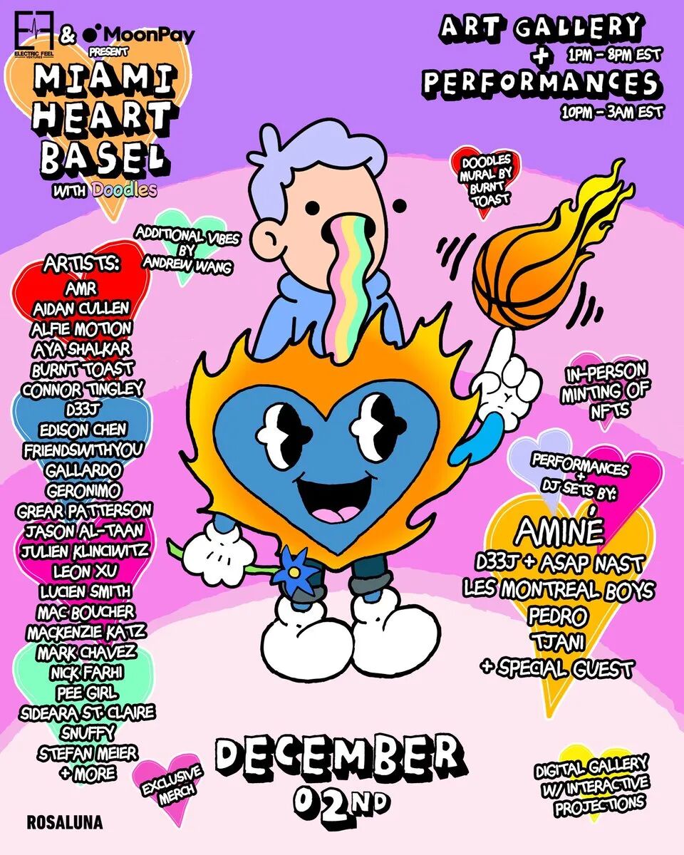 Doodles还计划成为一家娱乐公司, 他们策划的活动非常吸引人。去年12月,Doodles就与The Heart Project合作,在迈阿密巴塞尔艺术展期间举办了一场线下的活动。“迈阿密巴塞尔之心”活动包括限量版商品、画廊、Mint壁画和现场音乐表演。