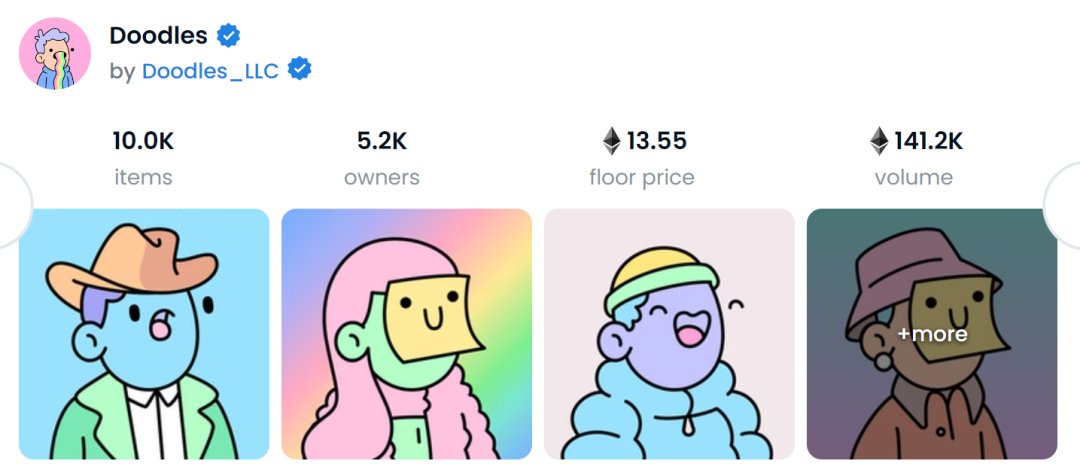 目前,Doodles NFT的当前底价为13.55ETH(约14,000美元),交易量为140.4K ETH。迄今为止,根据CryptoSlam的数据,它已经产生了近5亿美元的二级交易量