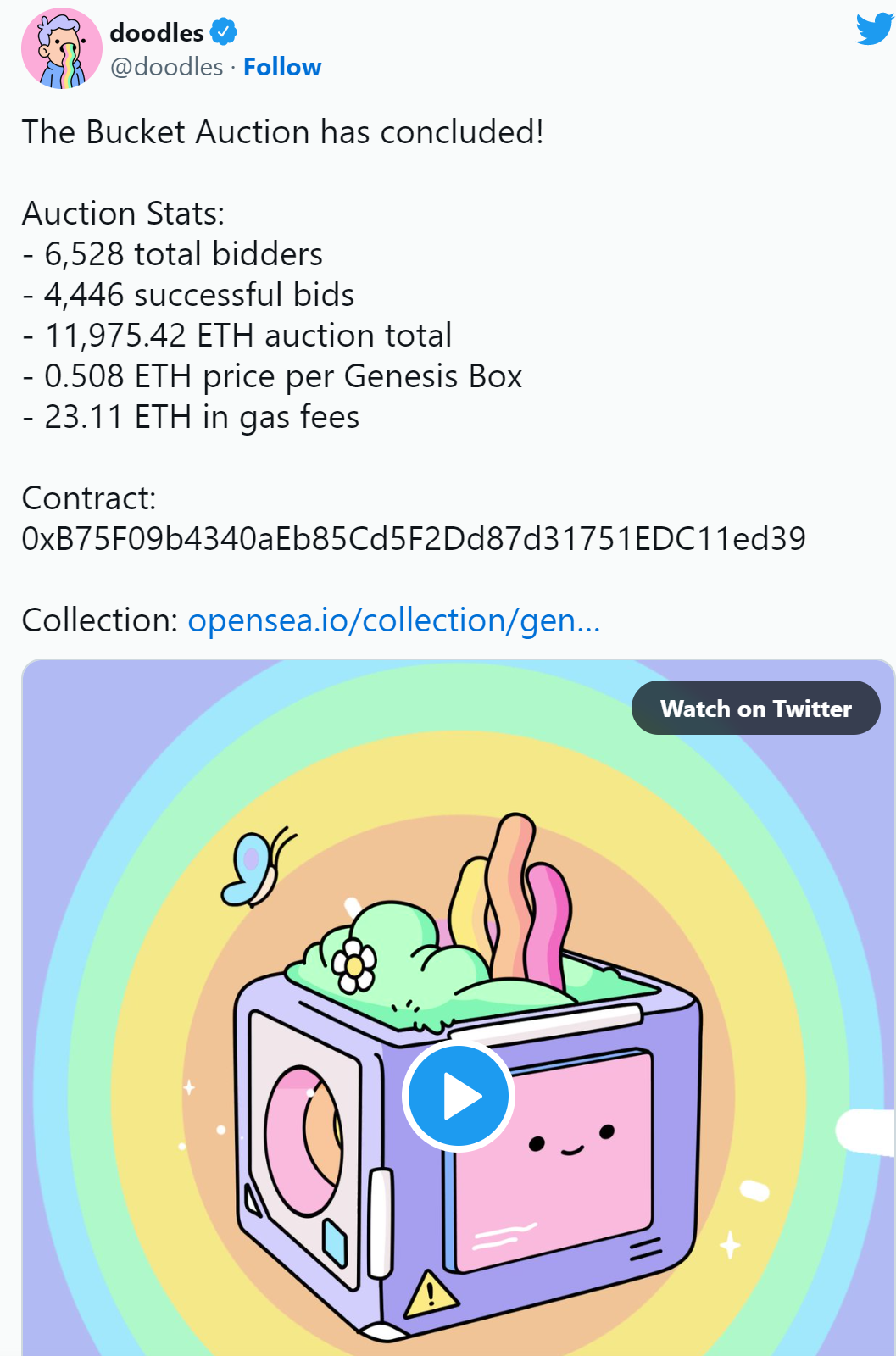此次Doodles总共有24,000个Genesis Box。前4,000个Genesis Box在 NFT.NYC 送给了Doodles持有者和他们的客人。其余20,000个Genesis Box NFT采取桶式拍卖的形式,拍卖最终价格为0.508ETH,共筹集到11975.42枚ETH(约合1317万美元),Gas费为23.11ETH。此次拍卖共有6,528人参与,其中有4,446人赢得拍卖。
