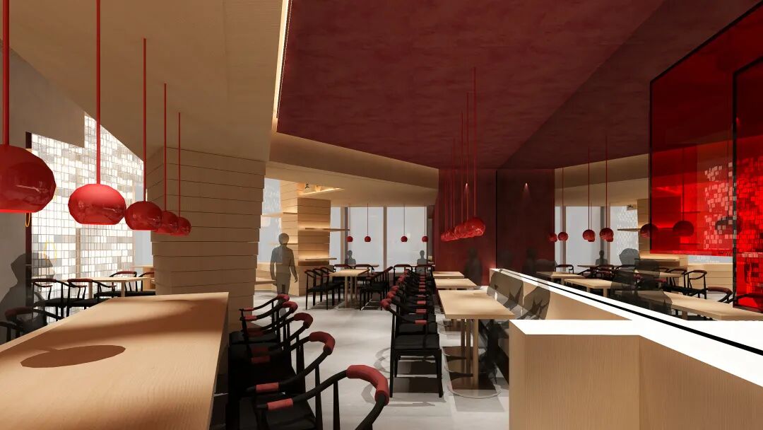 延伸至二楼的红色,通过深色不锈钢的收融,使得空间的猛烈气势在此得到缓冲与消解。通过块面的区分,材质肌理间的明暗对比使之得以被重新诠释。