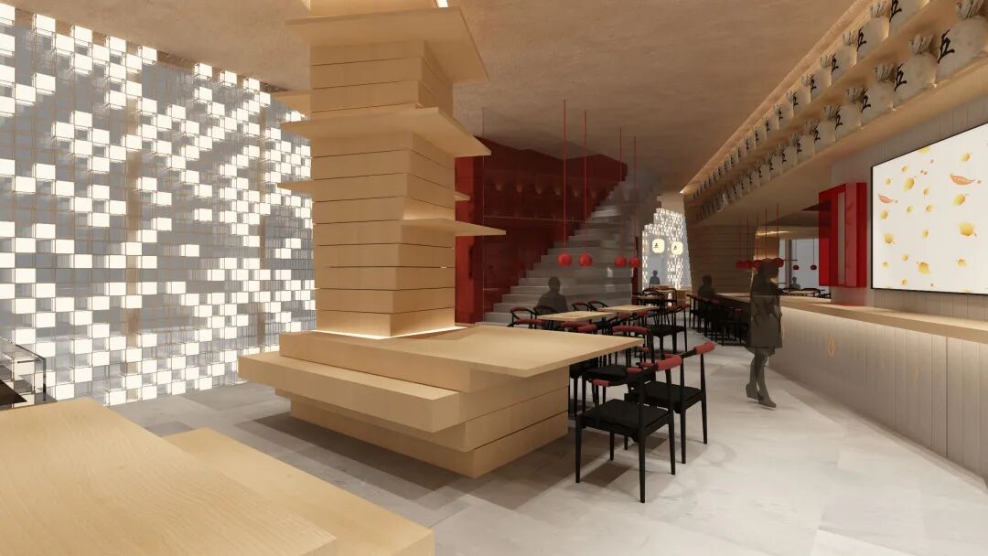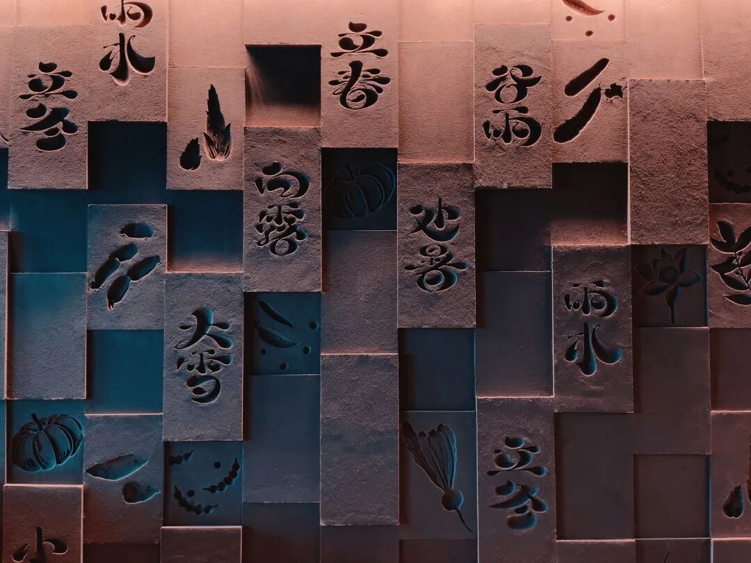 独特的24节气造型墙,将自然界的材料运用于室内,淡雅节制,充分体现了五芳斋“顺应自然,好好吃饭”的文化理念。