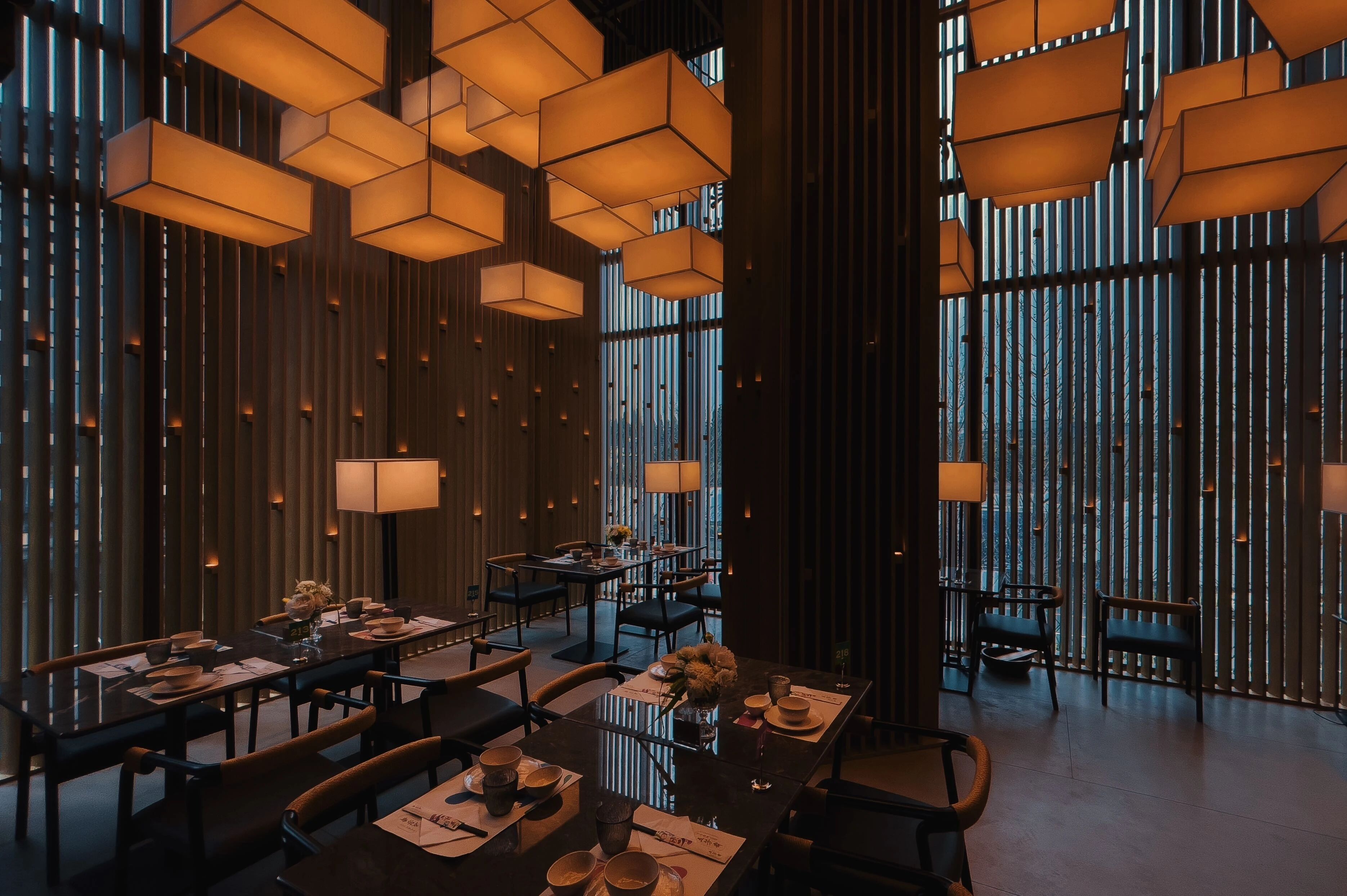 外景内借,大面积的落地玻璃幕墙,配以柔和、灵动的灯光,模糊了室内外空间界限。
