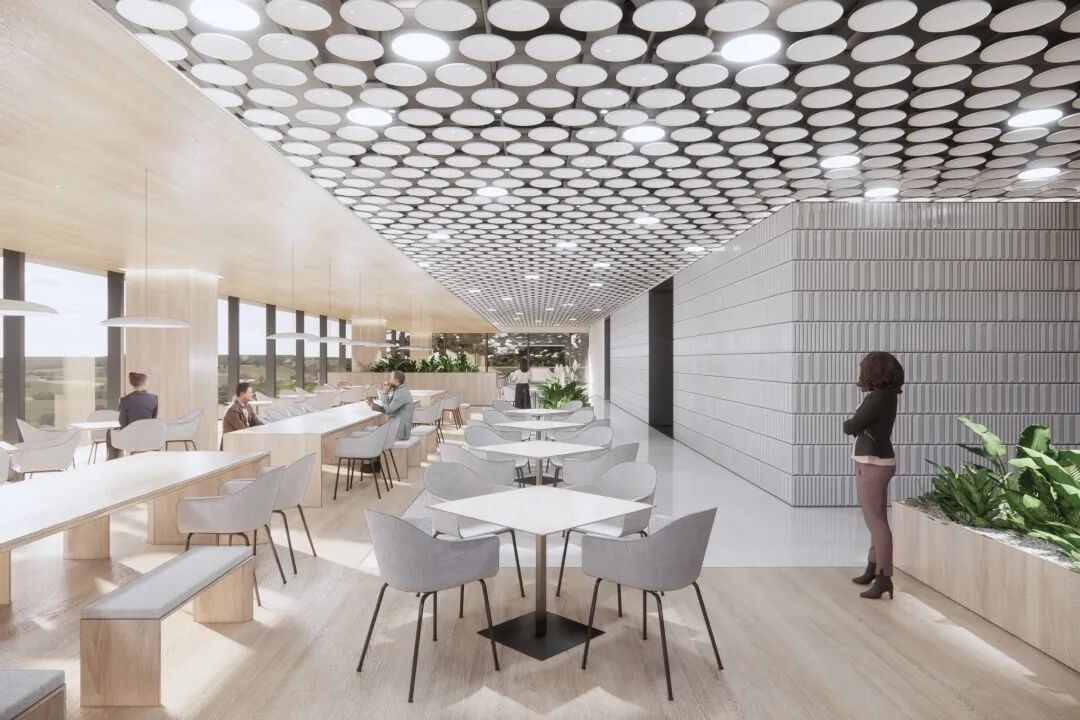 员工餐饮空间的超大落地观景空间,满足了员工生活所需的同时,极致保证自然理念的结合,一餐一饮都在宽敞明媚的室内,望眼的城市美景抚慰劳作的人们。