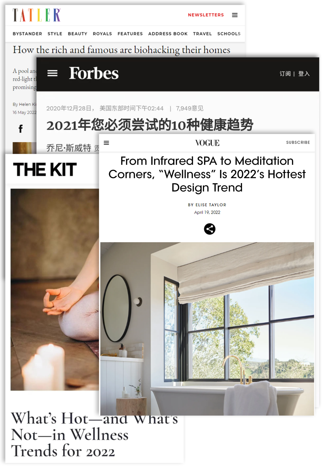 不管你是否留意到,最近欧美时尚风向标《VOGUE》《Forbes》欧洲时尚教主杂志《The Kit》《TATLER》……都不约而同的持续关注着“wellness”相关的一切科技、设计,以及时尚生活的方方面面。以至于2022年英语语系中已经出现的热门新词:“非接触式SPA”、“极简护肤主义”、“灵性生活”、“红外线SPA”、“红外线冥想Infrared meditation”……这些全新的英文新词,所代表的是一种风靡全球的全新时尚健康生活方式。