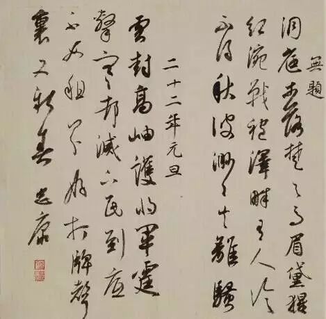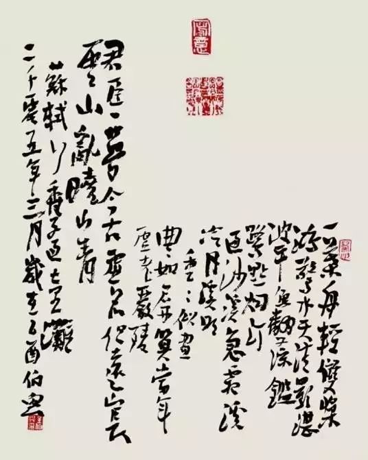 国画落款因其要与画面相契合,不受书法程式的束缚,容易创造出让人意想不到的独特效果。款文的天头地脚错落不齐或偏与一侧,布局灵动跳跃、环环紧扣,且留下较多的余白,虚实之间交错、映衬,营造出简淡空灵、宽松自由的意境。