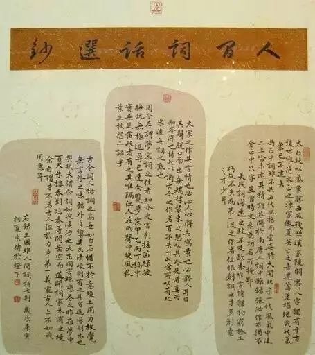 商品的商标既是一种醒目的标志,又是一种巧妙的点缀,书法创作亦可如此设计。采用异于正文书写的纸制作作品题签,内容可以是正文内容的出处、评价,也可以是作者、创作情况等的标注,位置宜安排在正文前后或幅式中间,从而达到作品“商标”的功用。