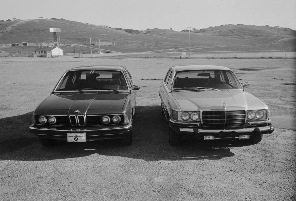 这张图应该拍摄于上世纪80年代,图中的两台车分别是宝马在1977年推出的第一代7系,代号E23,以及奔驰在1972年推出的第三代S级,代号W116。