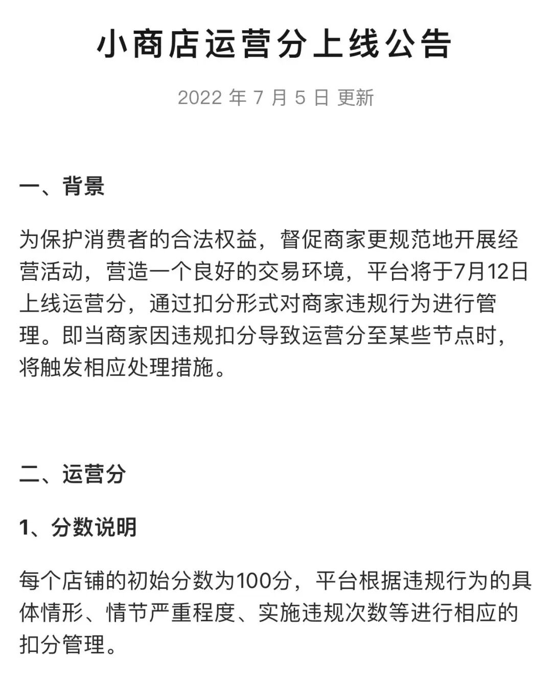 近日,微信团队发布小商店运营分上线公告,微信平台将于7月12日上线运营分,通过扣分形式对商家违规行为进行管理。即当商家因违规扣分导致运营分至某些节点时,将触发相应处理措施。