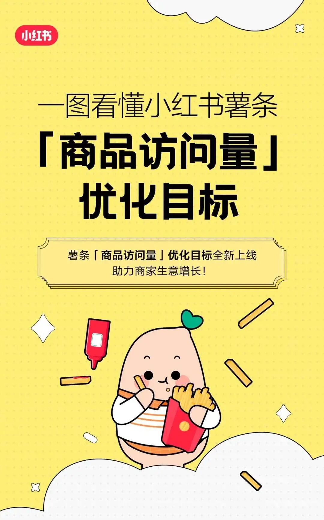 灵活高效的自助式广告投放产品——薯条,近期全新上线以「商品访问量」为投放目标的产品能力,帮助在小红书商城开设店铺的商家,以此为优化目标,提升商品详情页的访问流量,从而促进站内交易转化。