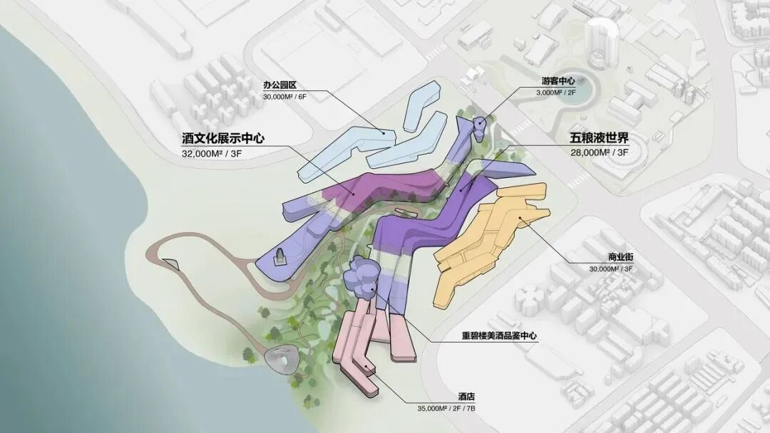 宜宾是五粮液的家乡,孕育了五粮液,而五粮液的品牌、历史和产品也回馈着宜宾和市民。奥雷·舍人事务所的设计概念深耕探讨这种亲密的联系,从总体上来看,该方案整体性强,故事线明确,运用现代的手法结合当地的风土人情,创造了这一山水诗篇。