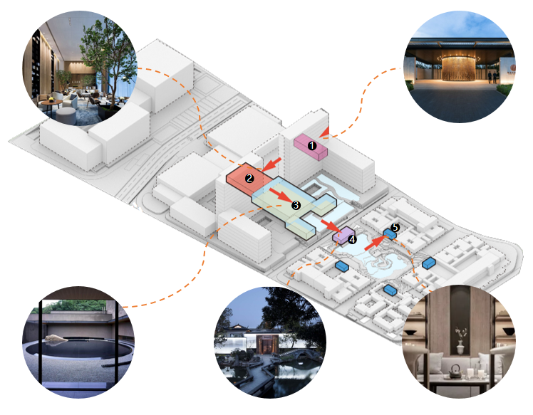 从中式的格局出发,都易的第一轮方案采用了“九重院、五进制”规划,以“礼、院、景、酒、游”为核心元素来打造富有五粮液特色的中式酒店。