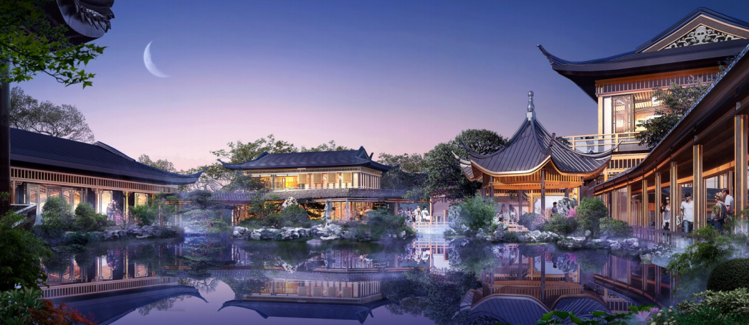 总体的风格借鉴了宋代建筑,亭台楼阁,错落有致,辅以现代灯光,显得富丽堂皇。方案中的核心景观借鉴了宋式园林“因其自然,辅以雅趣”的风格,形成可观,可行,可游,可居的院落空间,营造出古韵新雅的饮酒场景。