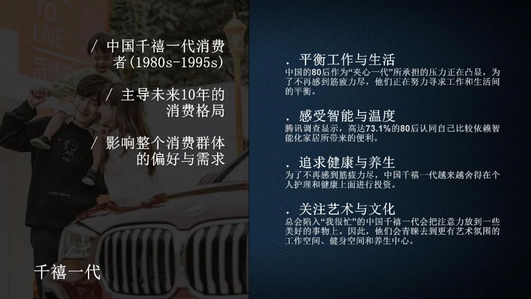 他们有四个特点:平衡工作与生活:我相信在座的每一位都一样,每天周旋在忙碌之中。在我们平常的生活当中,更希望有一个平衡的生活方式;感受智能与温度:今年在广州设计周有很多关于智能的品牌应运而生。根据腾讯的报告显示,高达73%的人认为智能为他们带来便利,这是未来很重要的趋势;追求健康与养生,千禧一代的人认为健康很重要,更多的运动;关注艺术与文化:希望自己在一个更有高度、涵养的定位里与我们的心里做到更好的配合,有生活更舒服的效果。