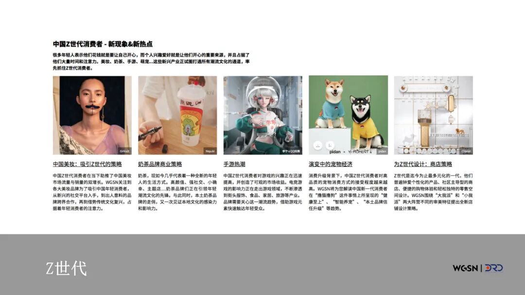 关于Z世代定位,WGSN和DRD会做出一份更细致清晰的定位分析内容,因为定位背后的所带来的,销售方式和模式都在改变。比如我们去一个奶茶店,它背后不仅仅是单纯的喝一杯奶茶那么简单,而是通过产生消费链接一群爱喝奶茶的群体。国潮店、美妆店、奶茶店、手游热潮、宠物经济,均为Z世代关注的领域,不仅仅是一家普通在里面可以选购产品的店,他需要的是一个能打卡的,而且产生新的消费模式的一家店。