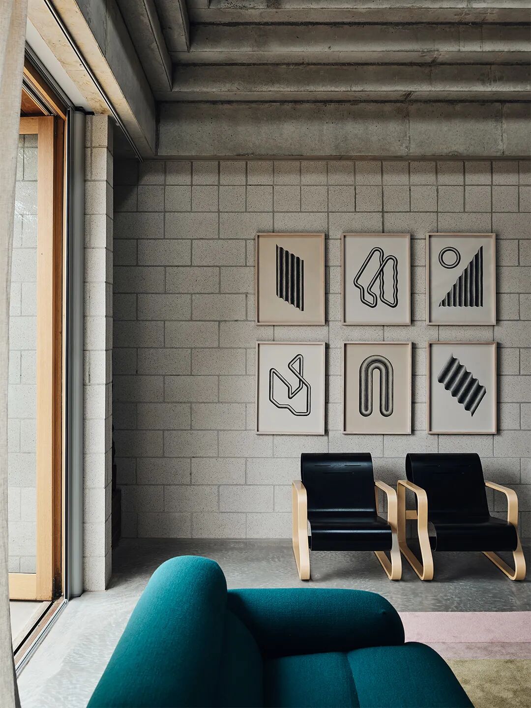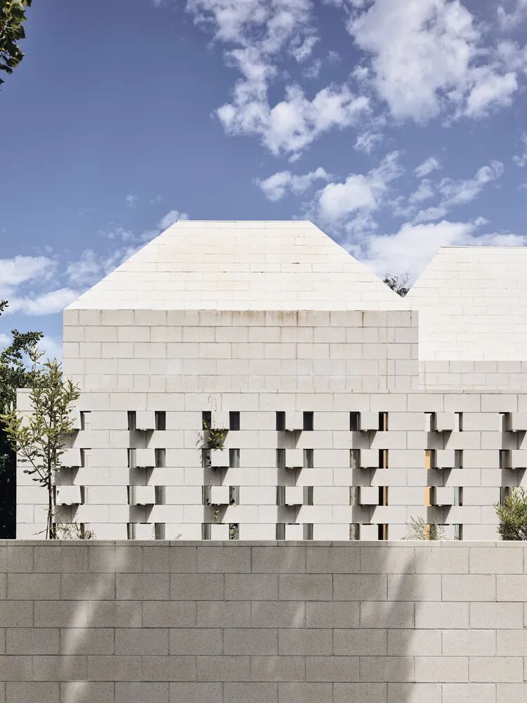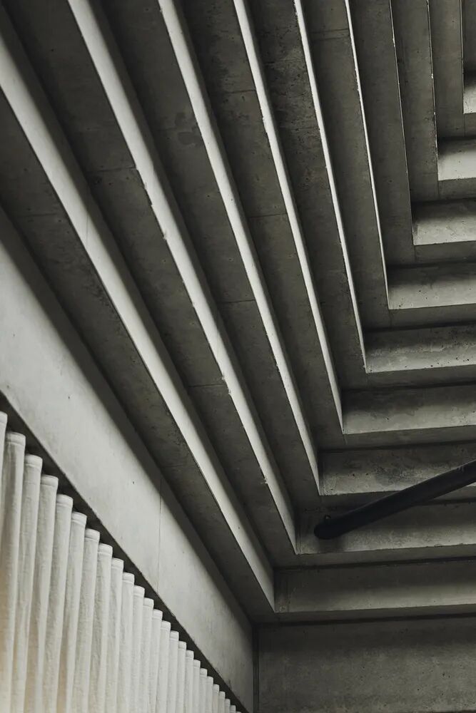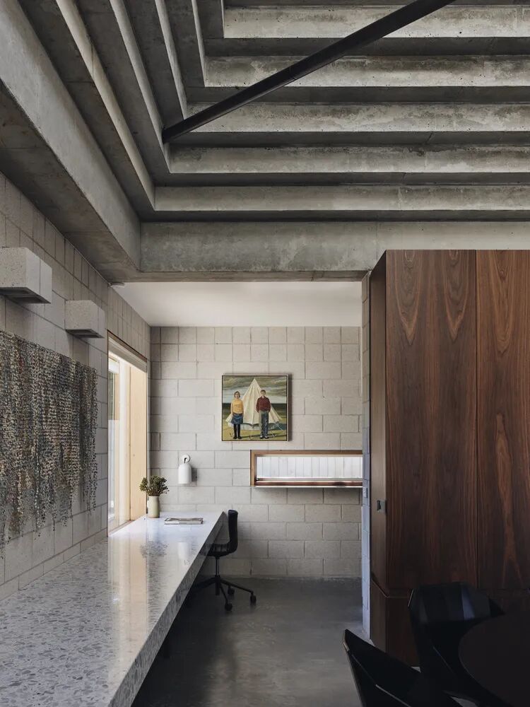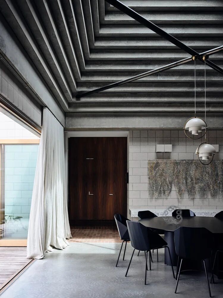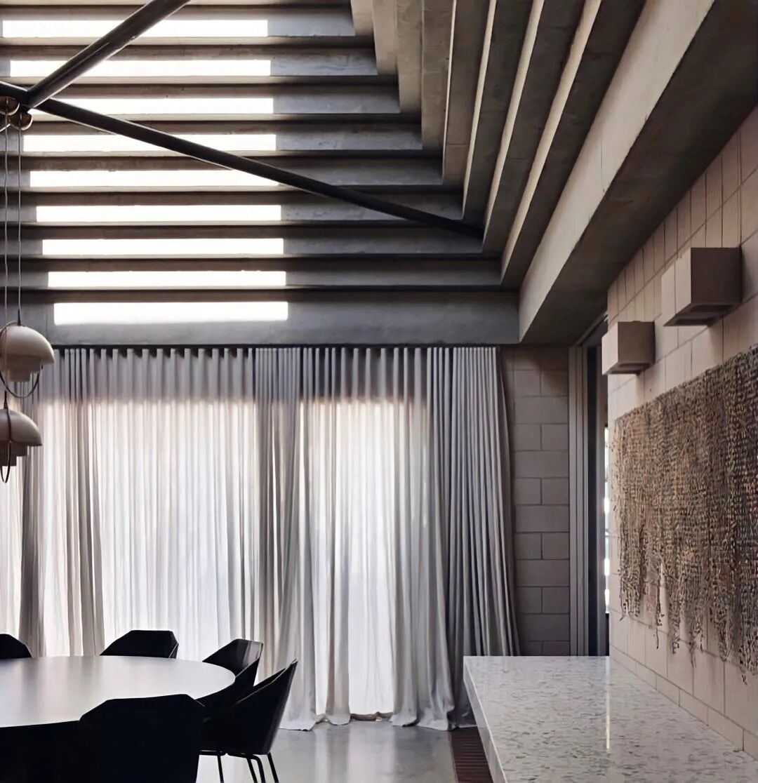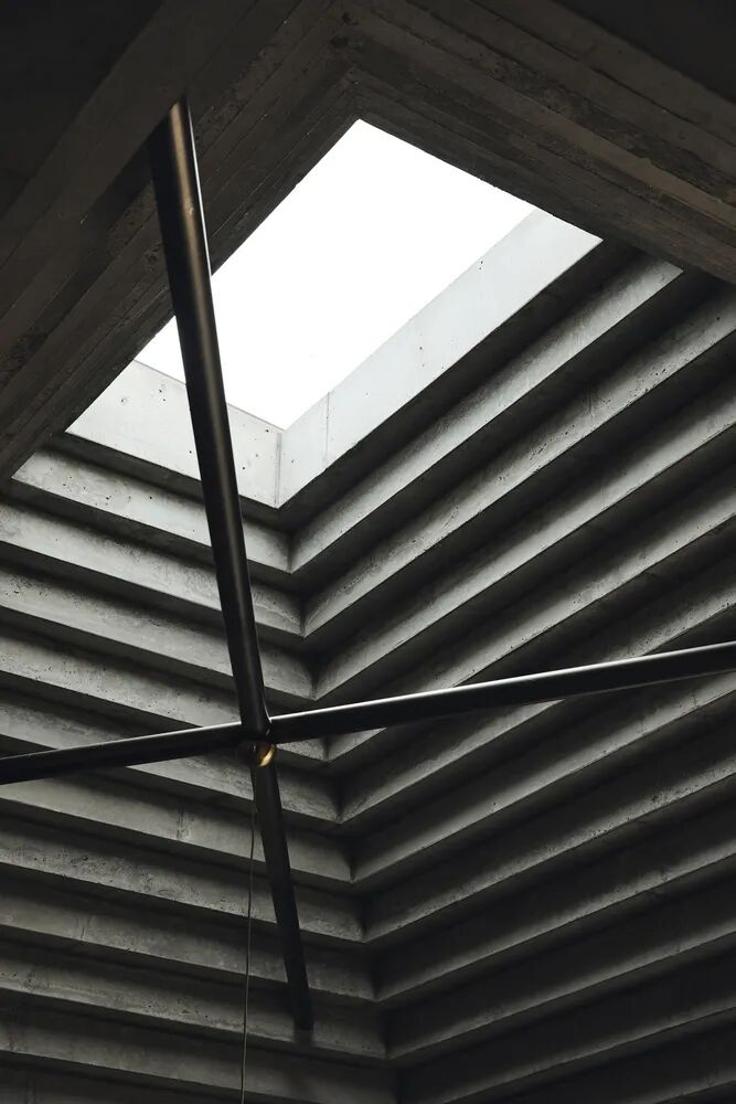 从室内看“金字塔”,是颇为震撼的反向阶梯式混凝土屋顶。它被运用在餐厅、起居室等公共空间内。顶部以玻璃封住,阳光与阶梯产生美妙的光影关系。