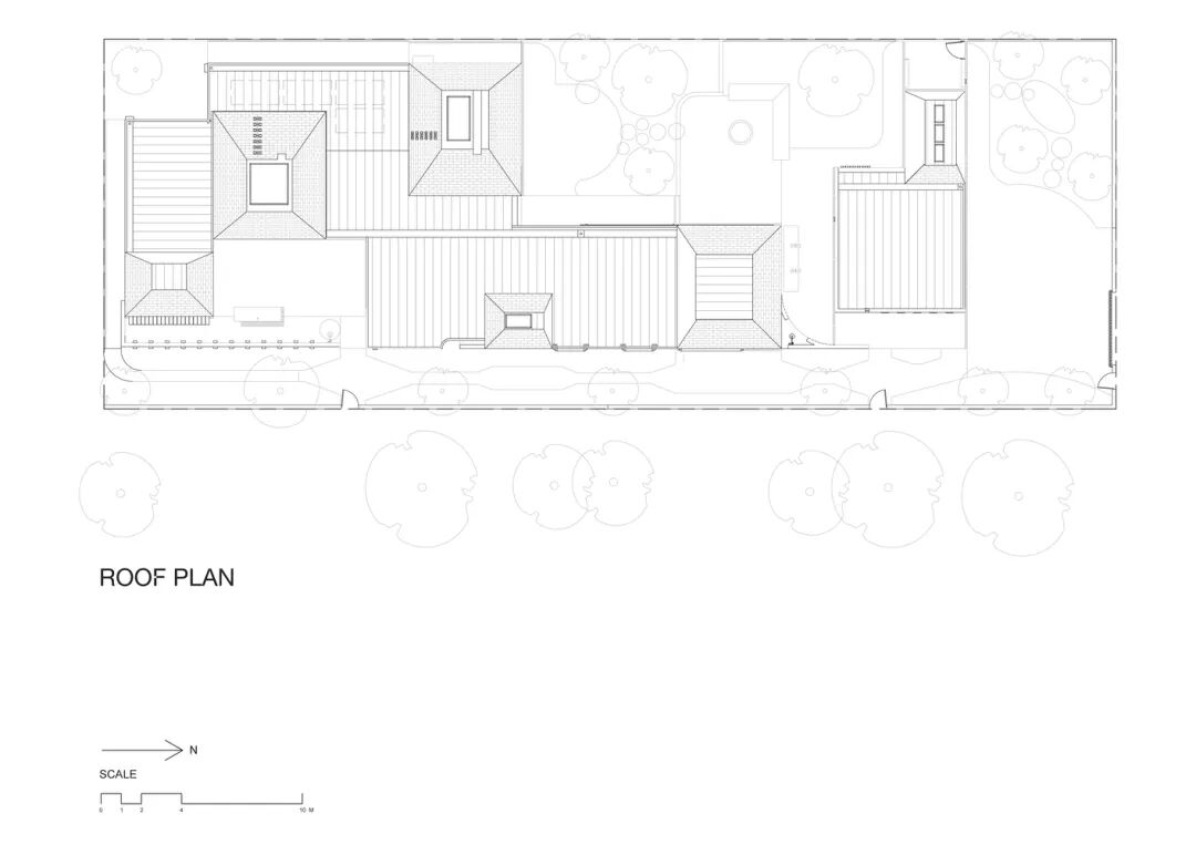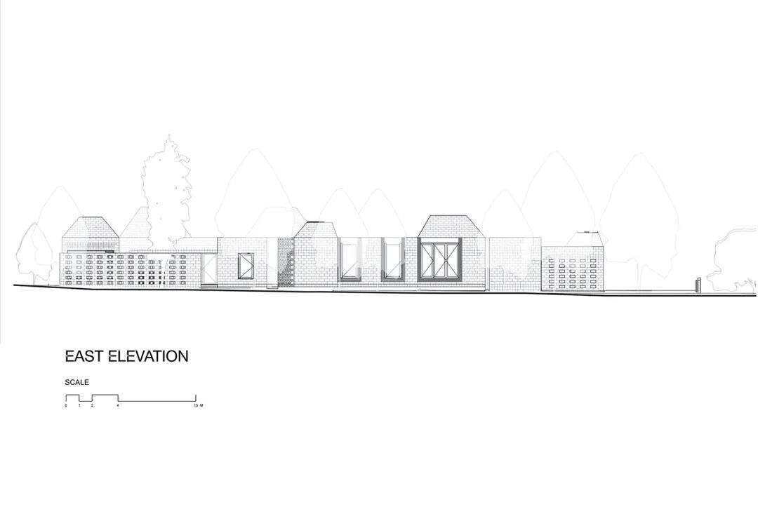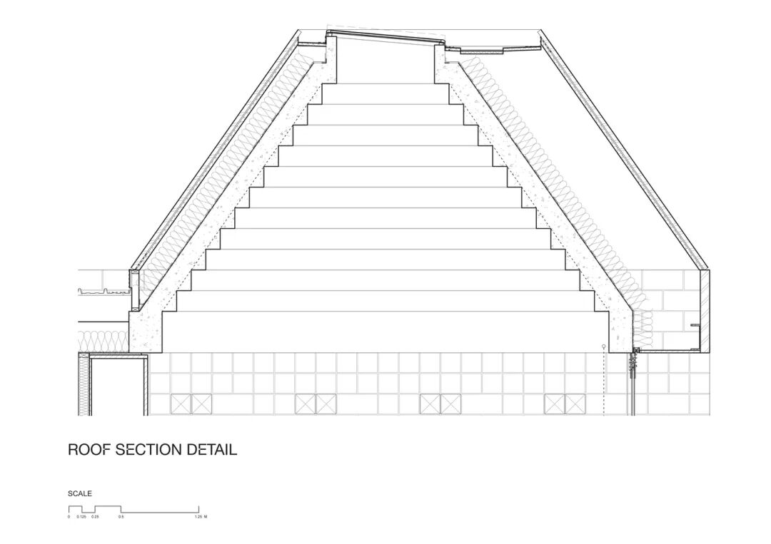 外部展示了平顶四棱椎体的屋顶,它与周围房屋一样有着倾斜的结构,但又与之区分开来。从街上看,这个特征为社区提供了一个新的维度,唤起了外面路人的好奇心。