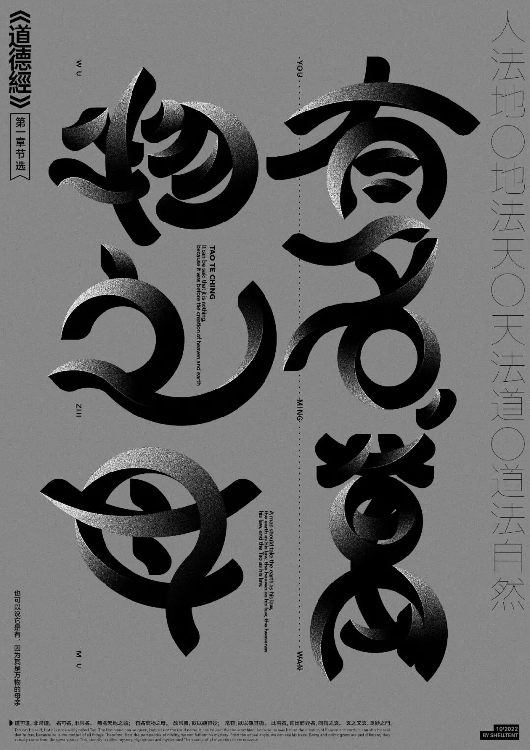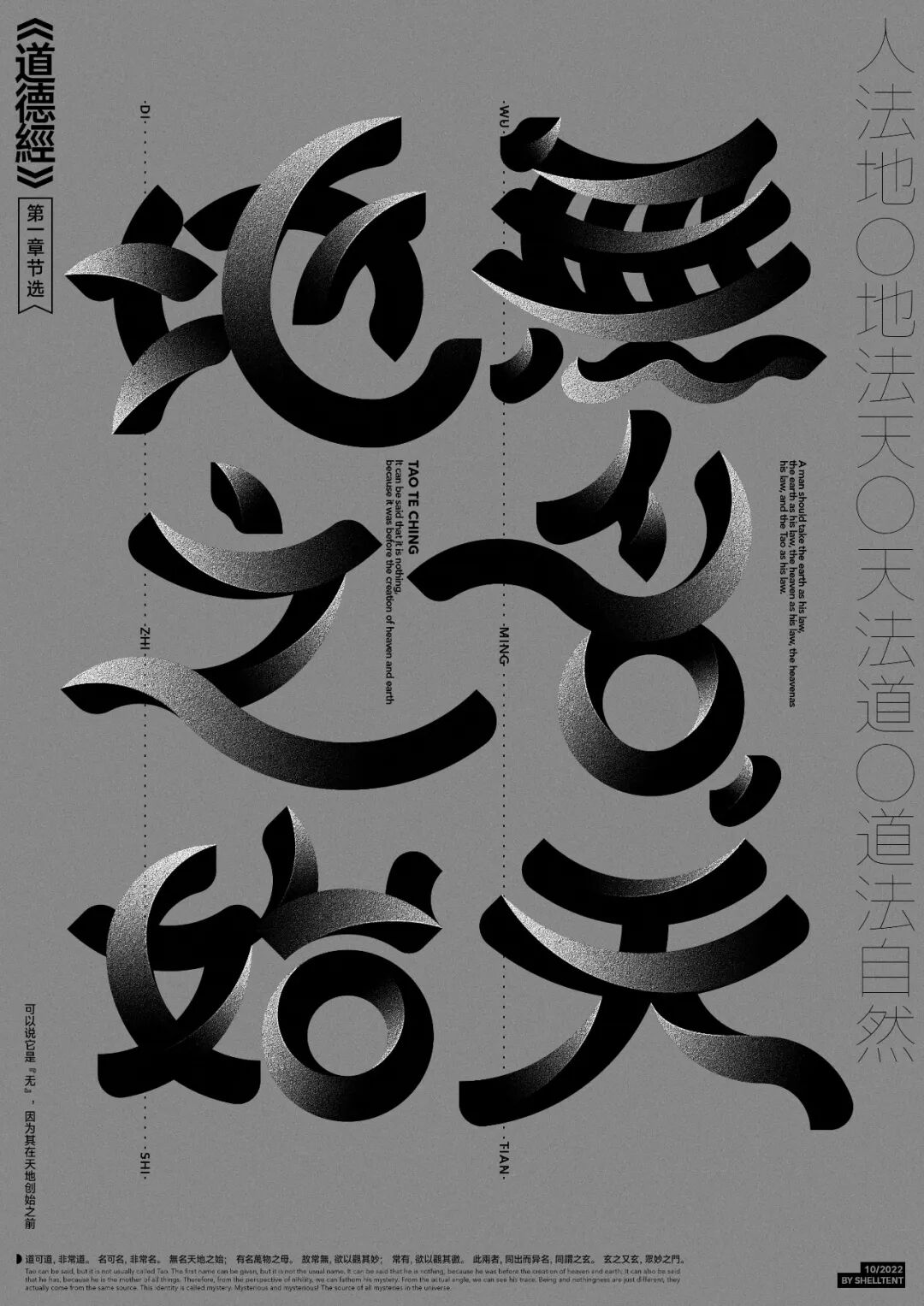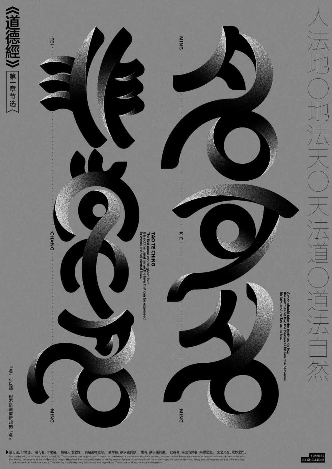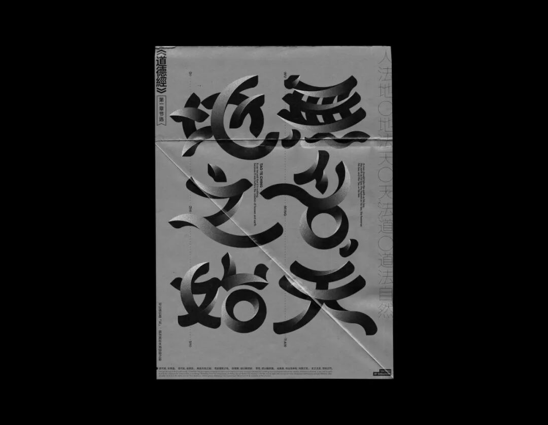 主要参考了@俩嘛liamsoso大佬作品的表现手法,之前也在be上看到过类似立体效果,觉得很有表现力和感染力,而其有明有暗的表现效果又恰好对应了阴阳的主题,就尝试研究应用了在字体上。之前也有酷友询问是如何实现的,我的方法是在ai做好字体添加黑白渐变和高光描边后,再在ps正片叠底多几层杂色即可实现。关键点还是具体在哪里添加立体效果和添加的杂色肌理细腻程度,这个需要凭借自己对字体的气质理解来把控。