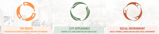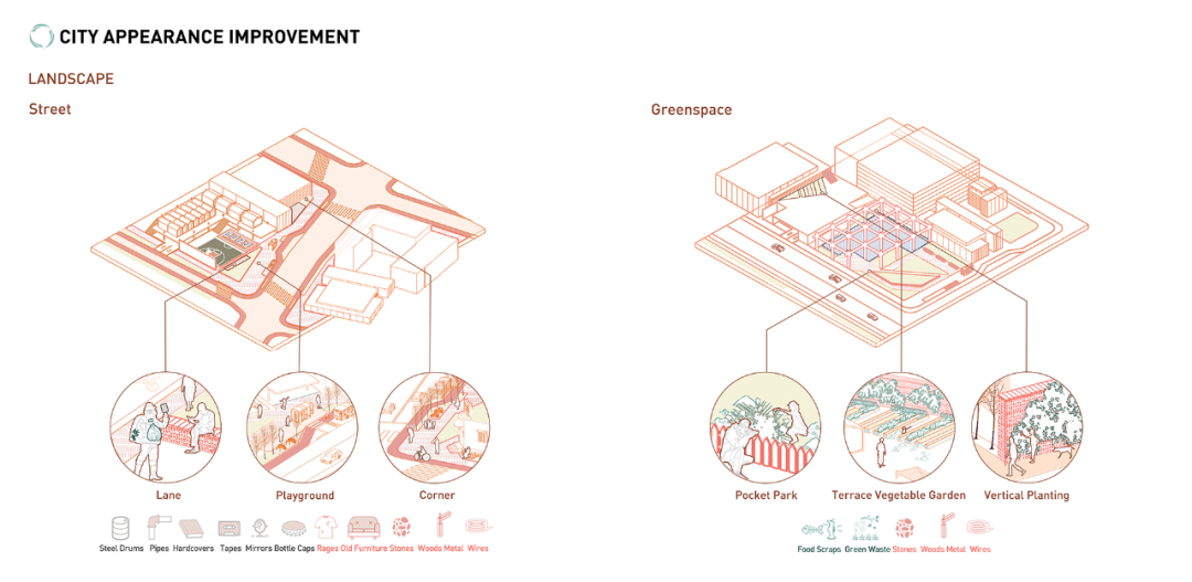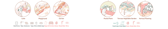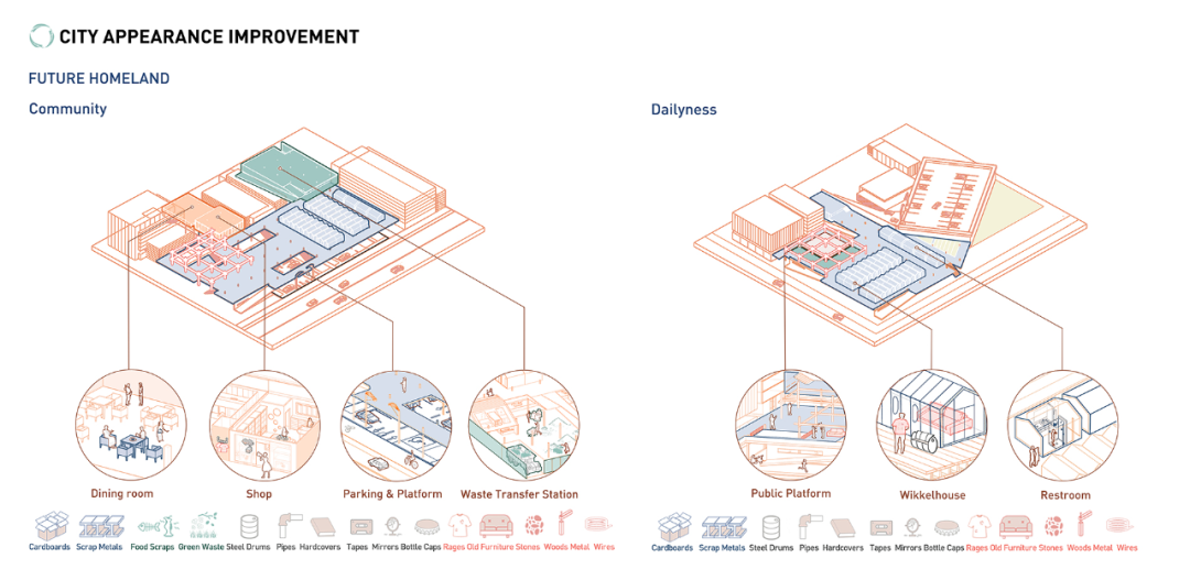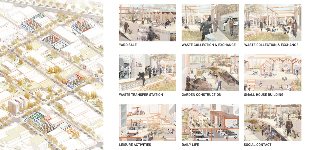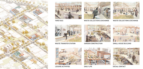 街区景观改造中充分利用垃圾回收再利用后的城市街道家具、肥料、艺术品等,与未来家园连通,形成多种结构层次,并设置口袋公园、运动场地、露天影院、跳蚤市场等共享公共空间,营造绿色、活力、平等的街区景观及活动。