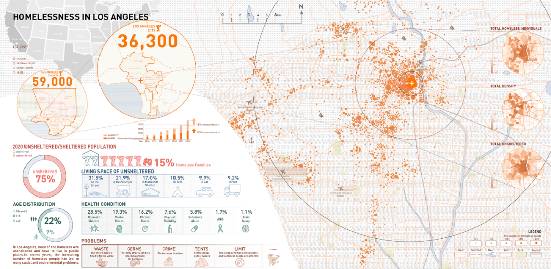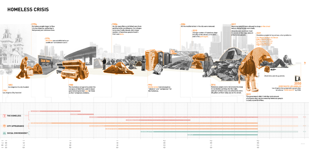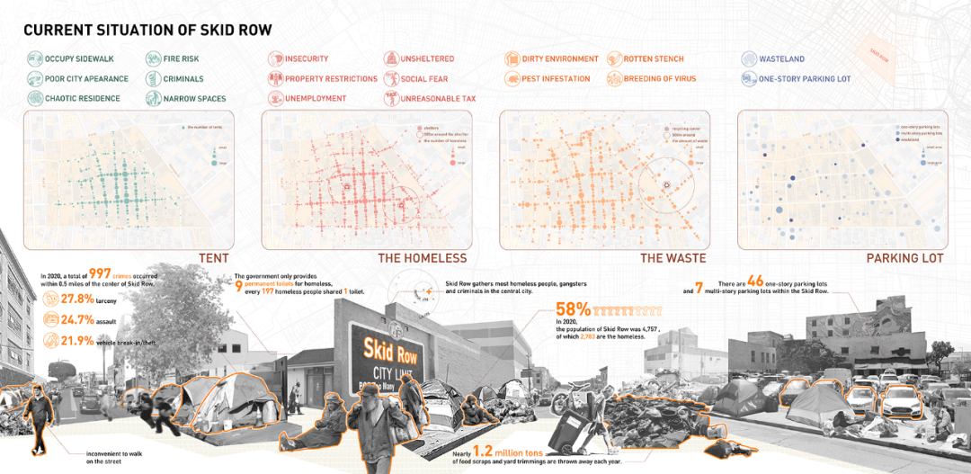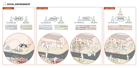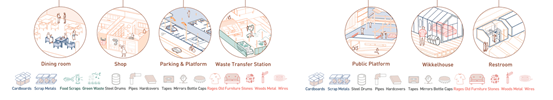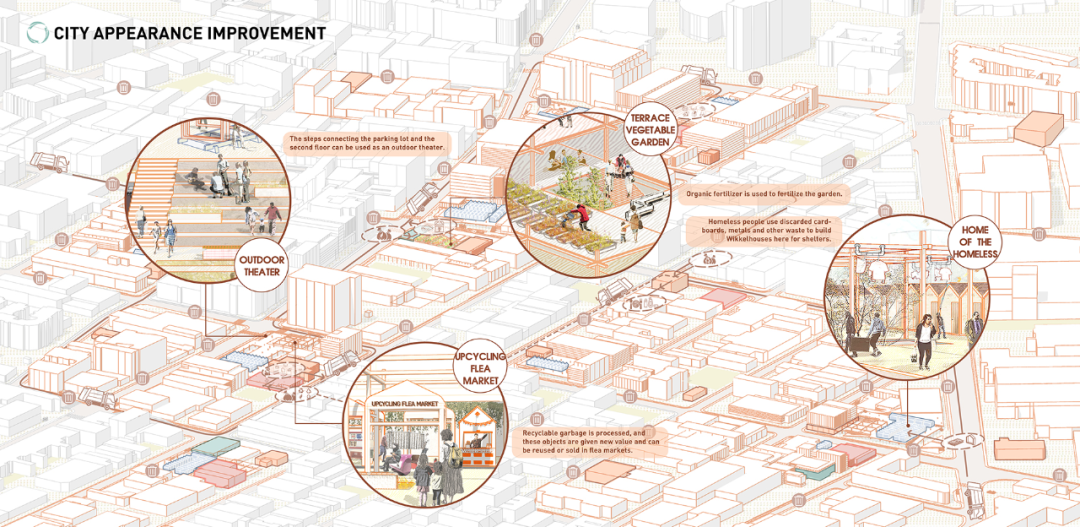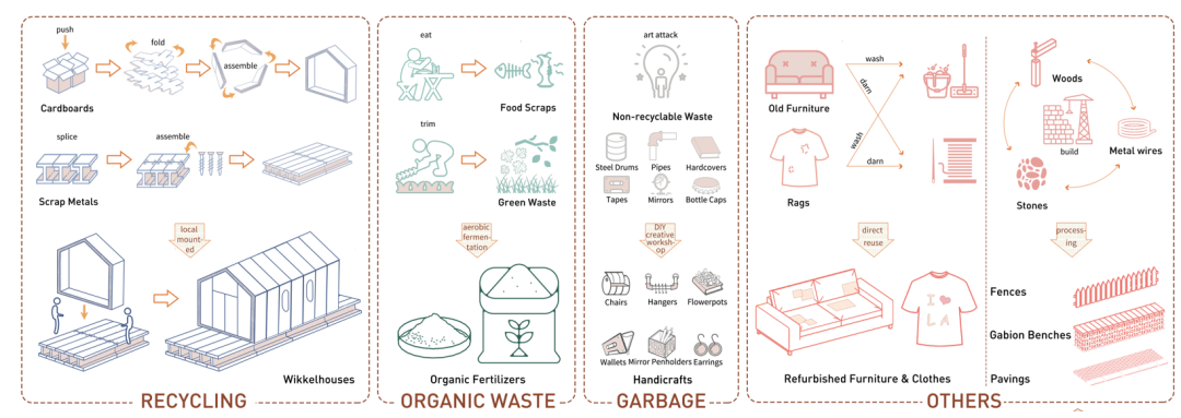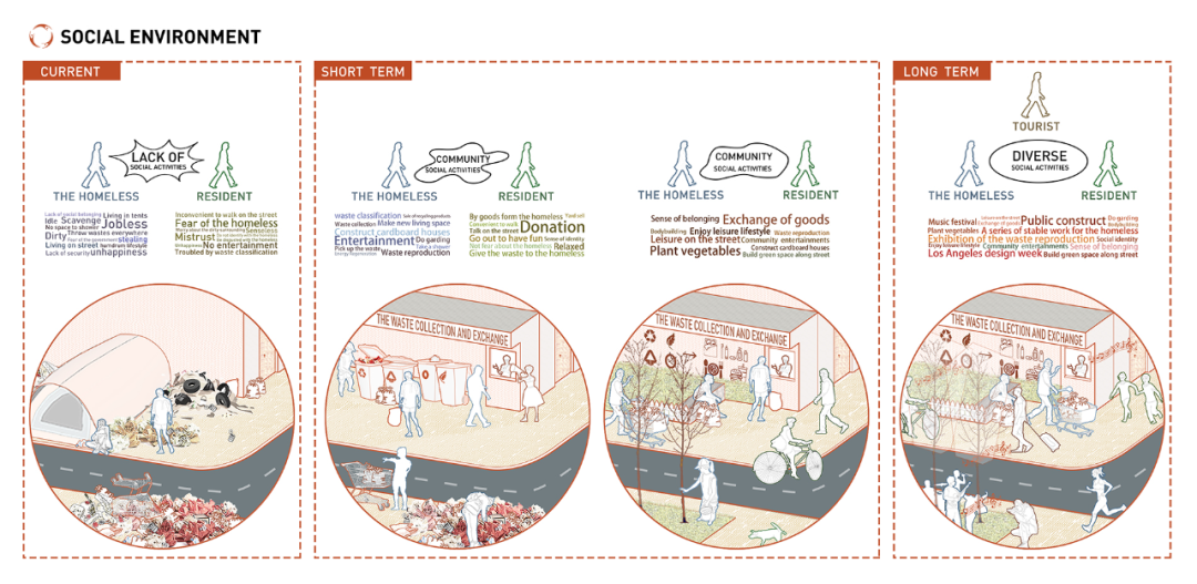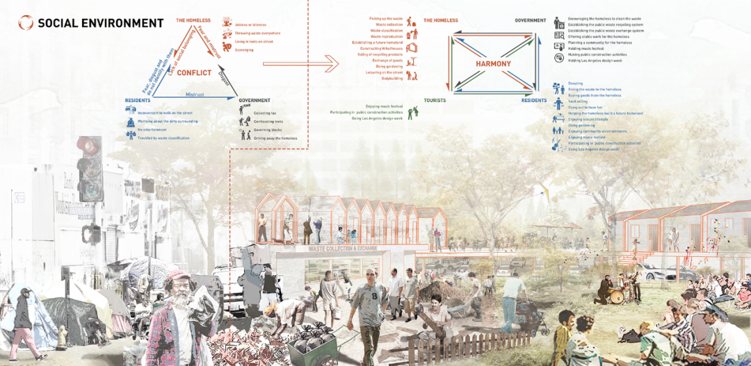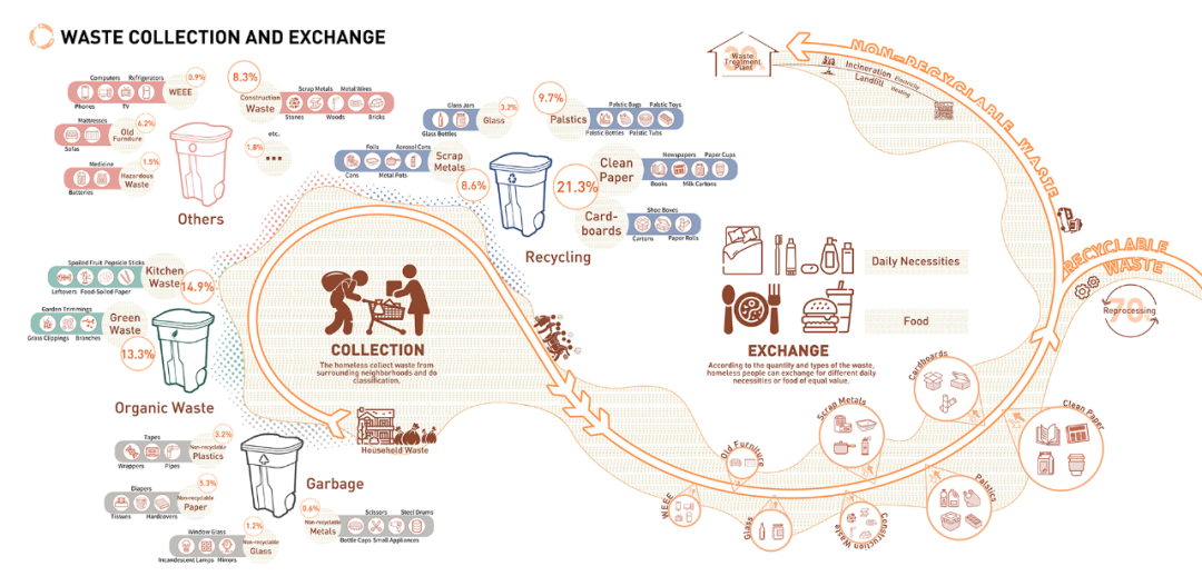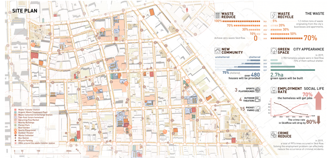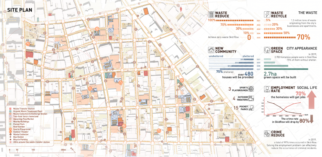 建立在地垃圾中转站,其中每个中转站的服务半径为200m,配合“零废物LA特许经营政策(the Zero Waste LA franchise policy)"制度,由流浪汉将skid row及周边街区的垃圾回收送至垃圾中转站,并根据当地垃圾分类的规定进行细致分类。不同的垃圾有不同的归宿,例如,可回收或可以再次利用的垃圾在街区内进行就地处理和加工,其余垃圾将送至城市垃圾处理厂进行统一焚烧或填埋。在此过程中,根据回收来的垃圾种类和数量,流浪汉可以换取同等价值的生活用品或食物以维持生活,同时也在一定程度上降低了犯罪的可能性。