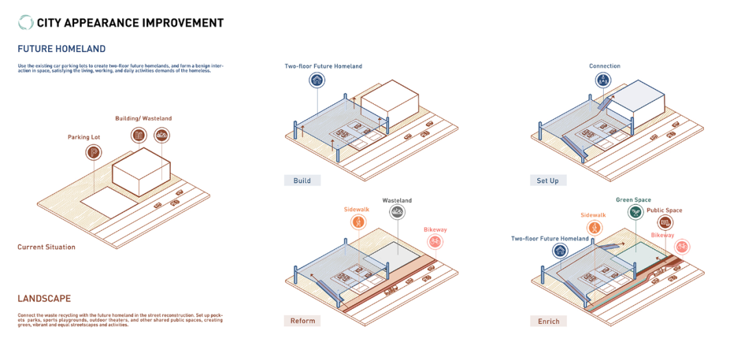 利用现有地面停车场、空地上方空间,将生活界面进行抬升,同时结合周边建筑的平屋顶,创造多层立体化的活动空间,将现状占据路面的流浪汉的生活空间转移至此,恢复城市街道的正常秩序。同时对街区中腾退出的街道和公共空间进行改造,丰富街区景观风貌和公共活动内容,并与纵向的立体空间相连通,形成社区-绿色空间-公共活动空间-步行道-骑行道-车行道结构层次。