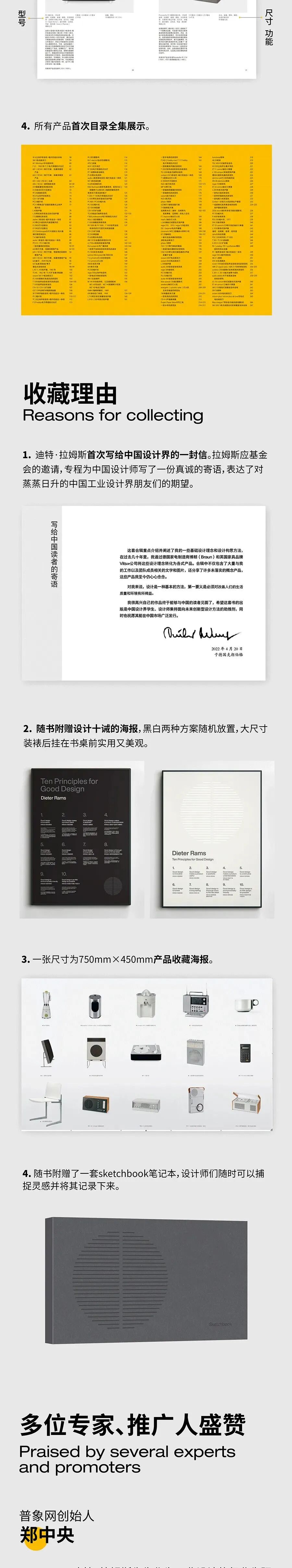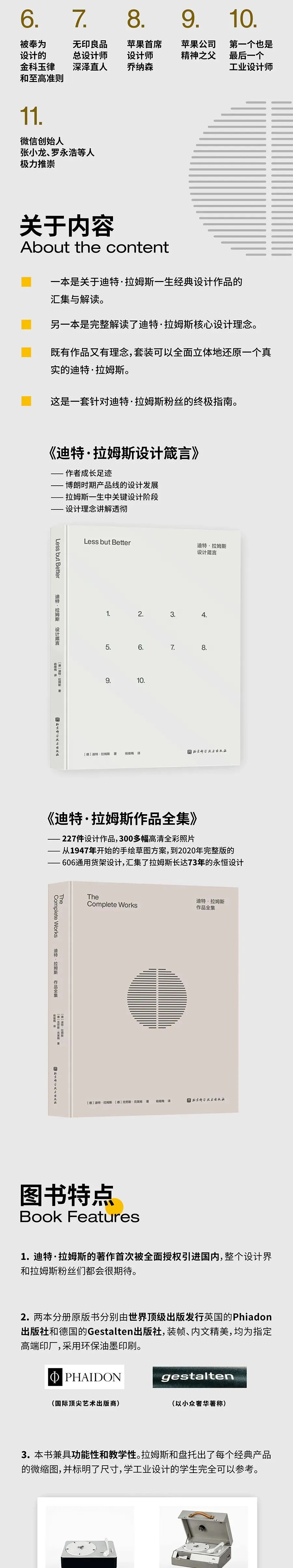 其次编者克莱姆在《全集》中并没有机械地介绍作品和设计说明,而是在与拉姆斯充分沟通的前提下,将它们根据拉姆斯的职业生涯划分为了四个阶段,并归类整理。他将拉姆斯作为一名设计师的成长过程,以及在不同时期的设计特点、设计潮流变迁,都巧妙地穿插在全书的行文之中。因此,对于那些不十分熟悉拉姆斯的人来说,书中提供了充足的有效信息。这些内容可以帮助读者们透过这些经典作品,进一步了解到迪特·拉姆斯这位享誉国际的设计大师的成长足迹,并顺带从中管窥到前半个世纪世界工业设计领域的潮流变迁。