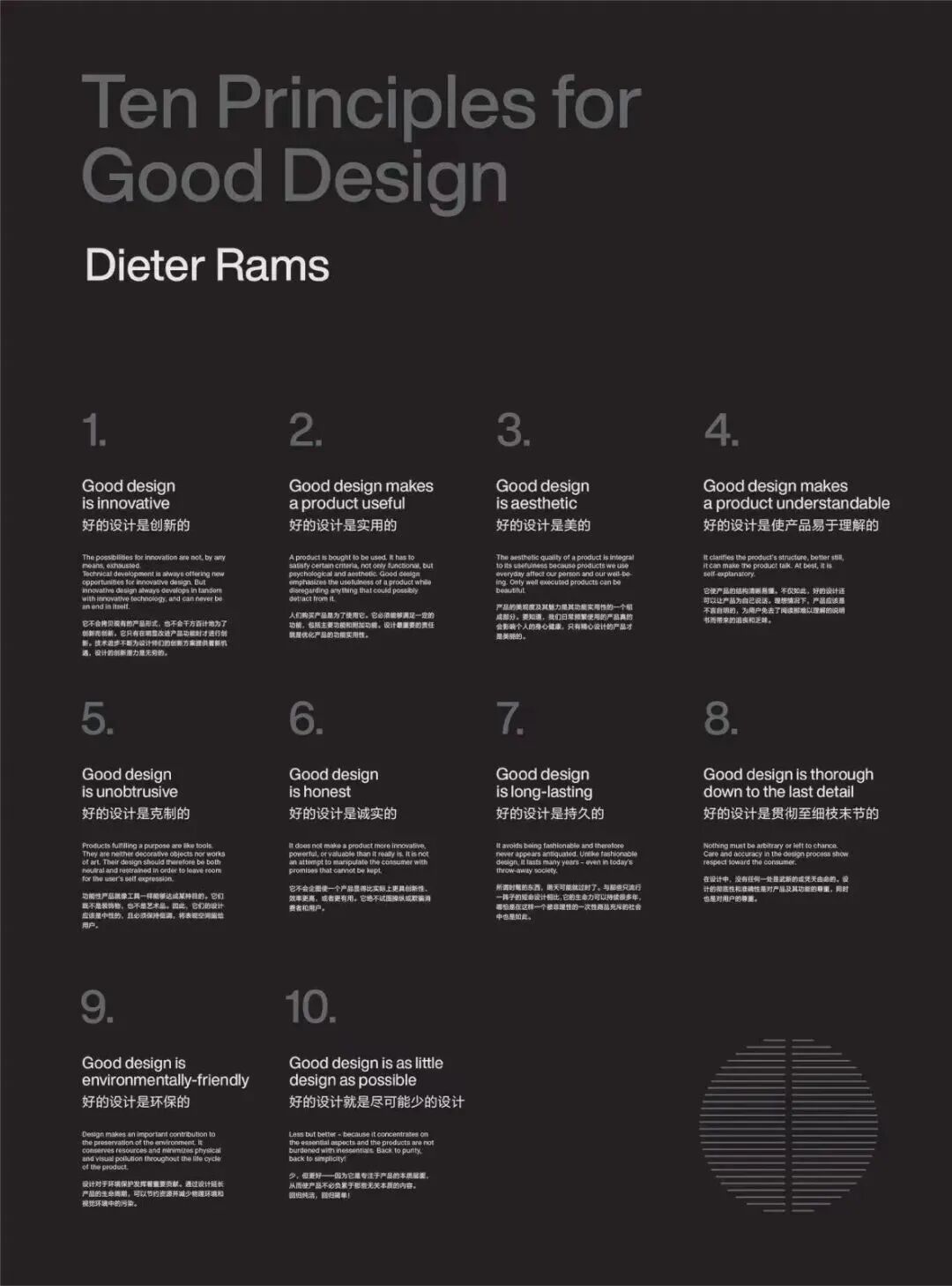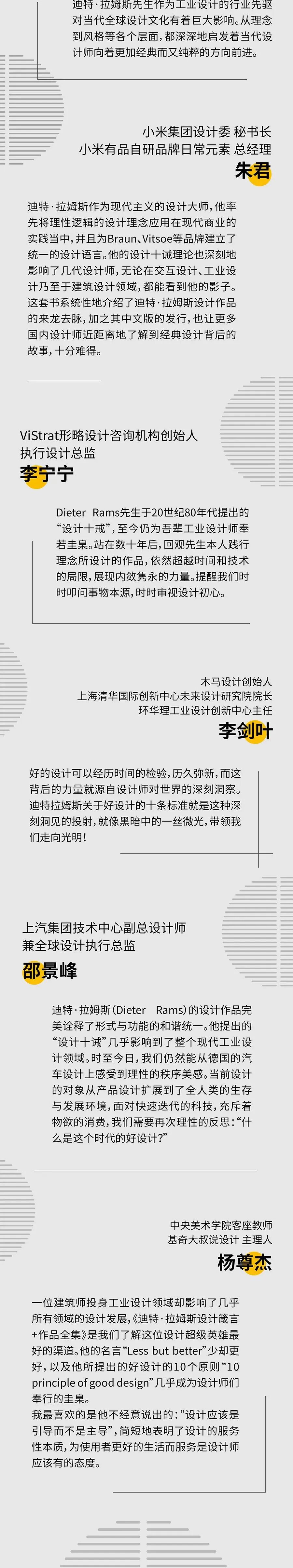 “我们应该把自己从太多东西围绕的累赘中解放出来。在我看来,对秩序的渴望——追求简单、冷静、克制、寿命更长、更美观、更有用的形式——比不断尝试去发明下一个好东西要重要得多。”