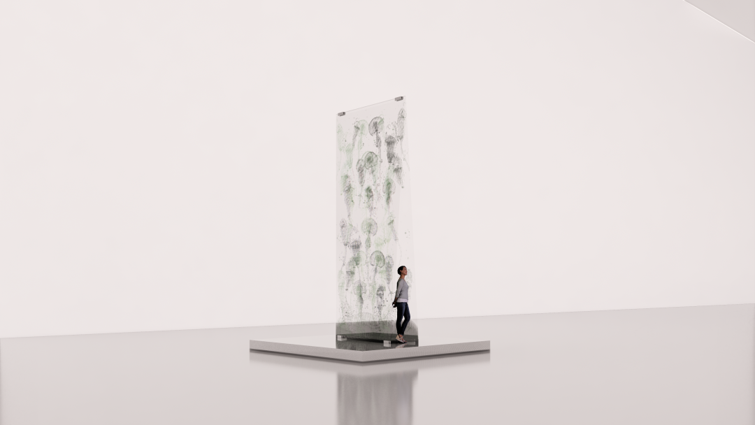 这次装置的题目叫“A Slice of Transparency”。现代主义以来建筑师对于透明性一直有一种天然的狂热。一方面它几乎什么都没有,而另一方面它又引发了各种真实的幻象。我们将两片超常规尺度(5.4m*2.4m)的直纹曲面(ruled surface)玻璃连接,通过一定的角度相互抵消玻璃自身的侧向力,来实现装置的稳定。玻璃间的空隙让观者在两侧观看装置时产生透视上的重叠,形成图案镜像的观感。而水母就是这次幻象的载体,它作为海洋生物中唯一一种身体含水量达到95%的物种,几乎达到了透明的极致。水母像素化的图案叠合所产生的象征意味,切割出了那些异样的感受,漂浮、游离、涣散、失焦…这也许是一种反体验(counter-experience)的表达。